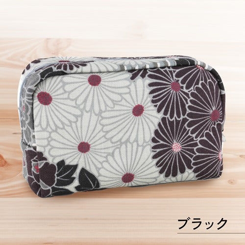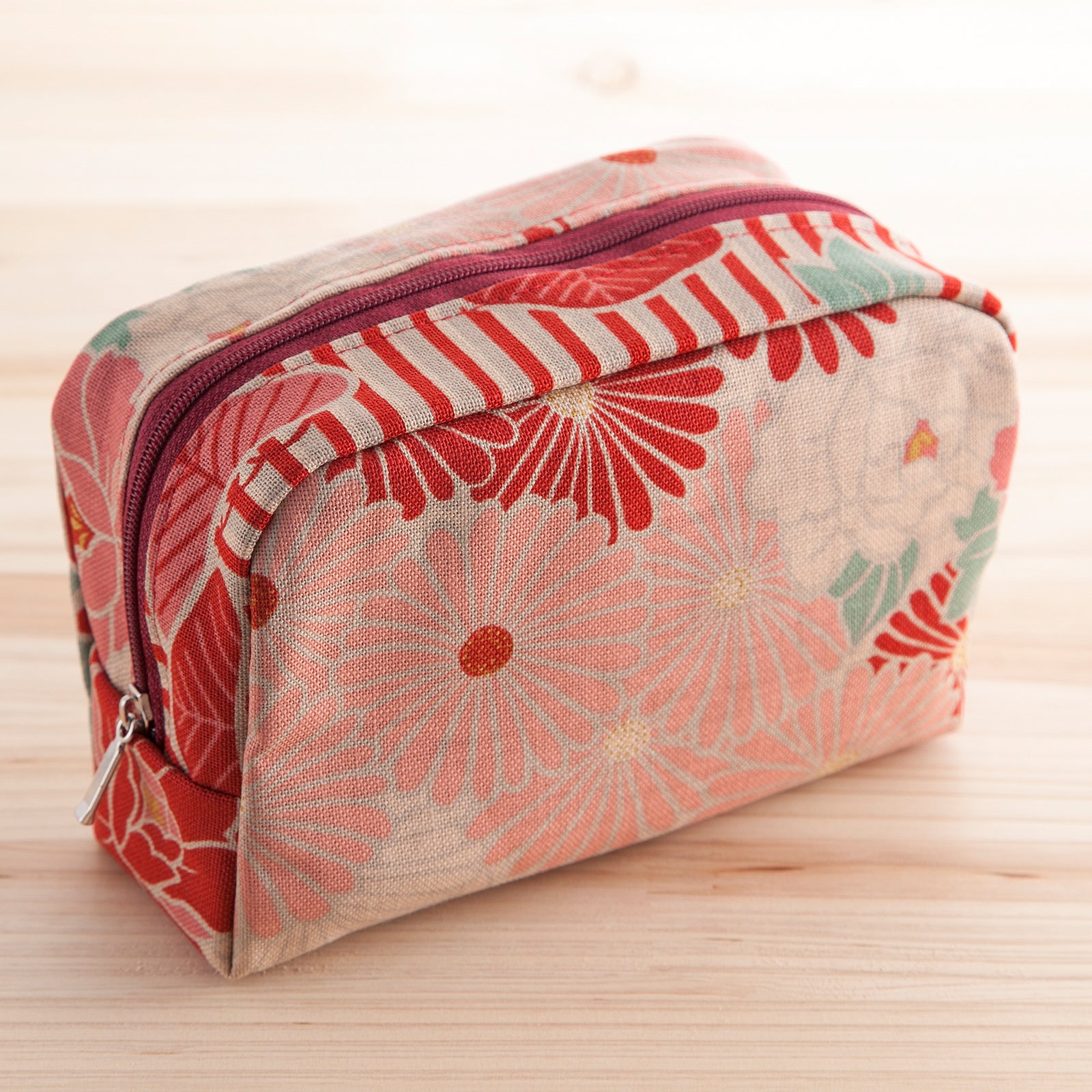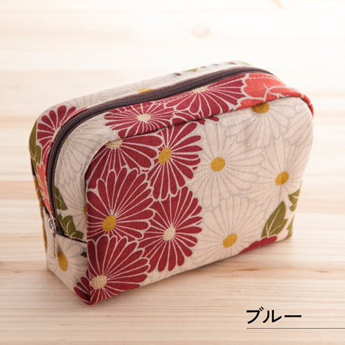 のレン オリジナルファブリック「レトロフラワー」生地を使用した、当店オリジナルのボックス型ポーチです。日本の伝統的な花である菊や牡丹をモチーフにした、上品かつ可愛らしい和風の花柄が魅力。持っているだけで日常をエレガントに彩り、外出先での使用に重点を置いた機能性で、あなたの身の回りのアイテムをスマートに整理します。綿100%の素材なので柔らかな手触りでありながら、しっかりとした縫製で長く愛用いただけます。