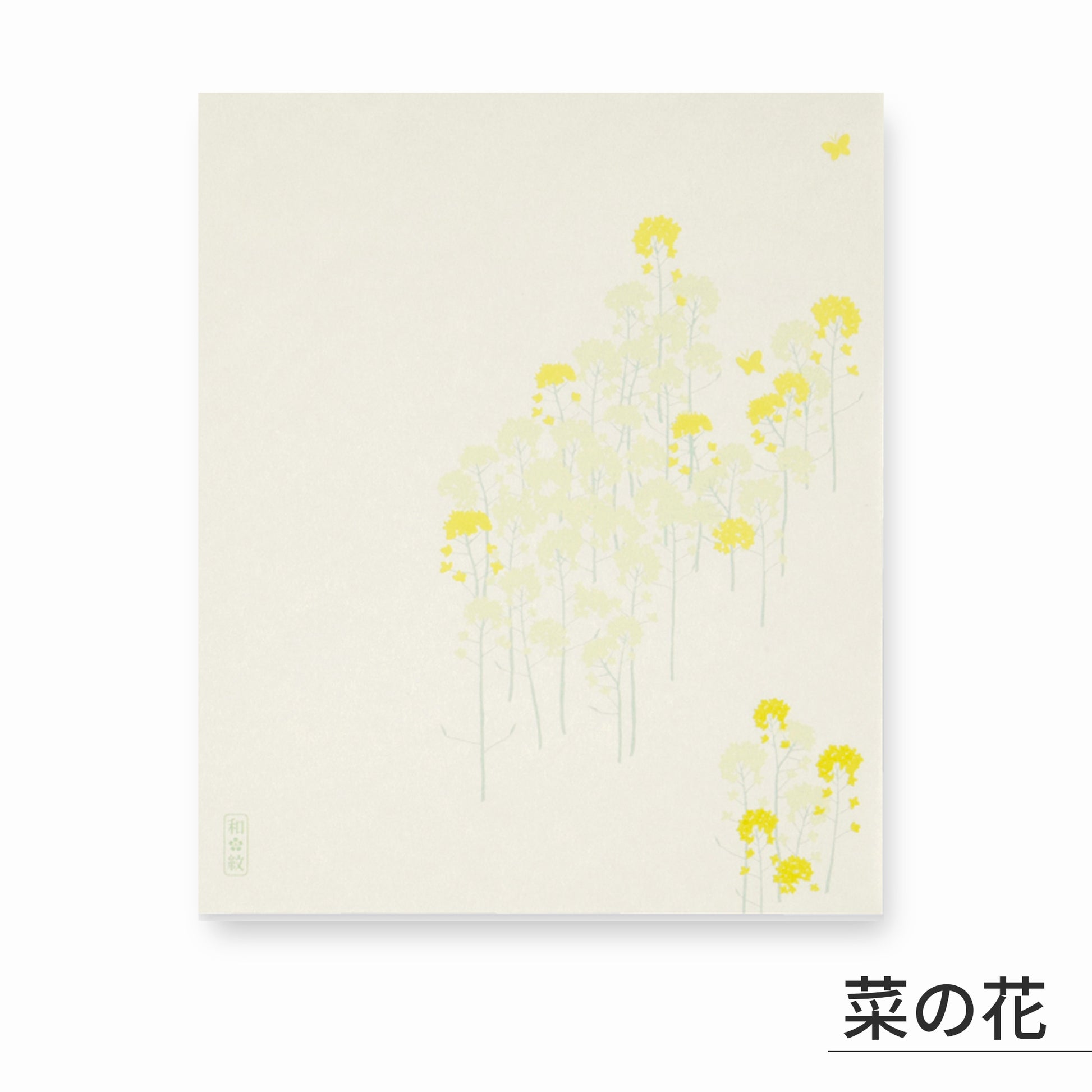 背景にはごく淡く、透明感のある菜の花が描かれ、重なり合う奥行きが春の霞がかった空気感を表現。そこに小さな蝶が舞い、自然の中に命が動き出す喜びを感じさせます。華美ではないけれど、見ているだけで心がほころぶような、控えめで可憐な美しさ。春のお茶席はもちろん、季節のご挨拶や贈り物に添える紙としてもぴったりです。新しい季節の訪れをやさしく知らせる、爽やかで軽やかな春の懐紙です。