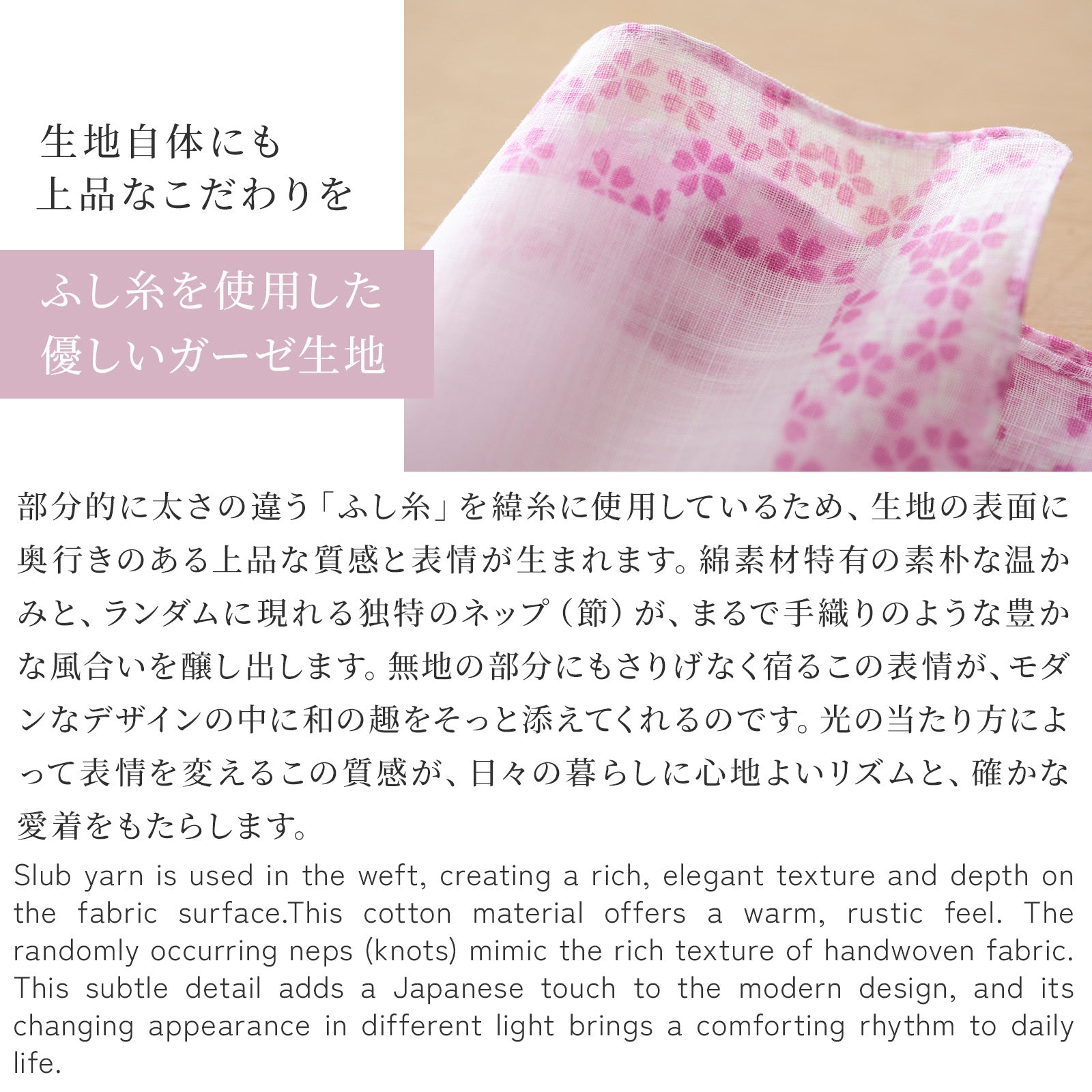 上質なガーゼ生地に、部分的に太さの異なる「節糸」を緯糸に使用。光の加減でニュアンス豊かな表情を見せ、無地の部分にも自然な凹凸と上品な質感が宿ります。さらりとした手触りと、柔らかく吸水性のある綿100%の素材は、毎日の暮らしに寄り添います。
