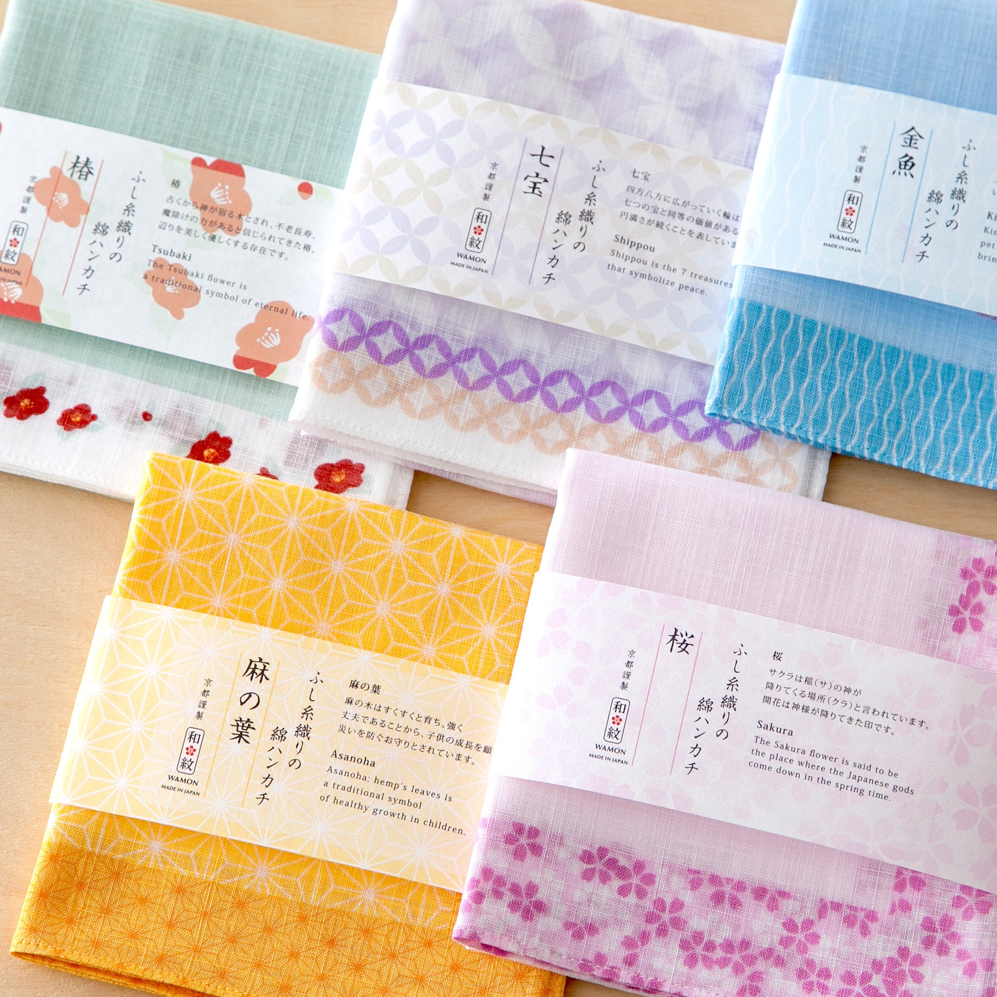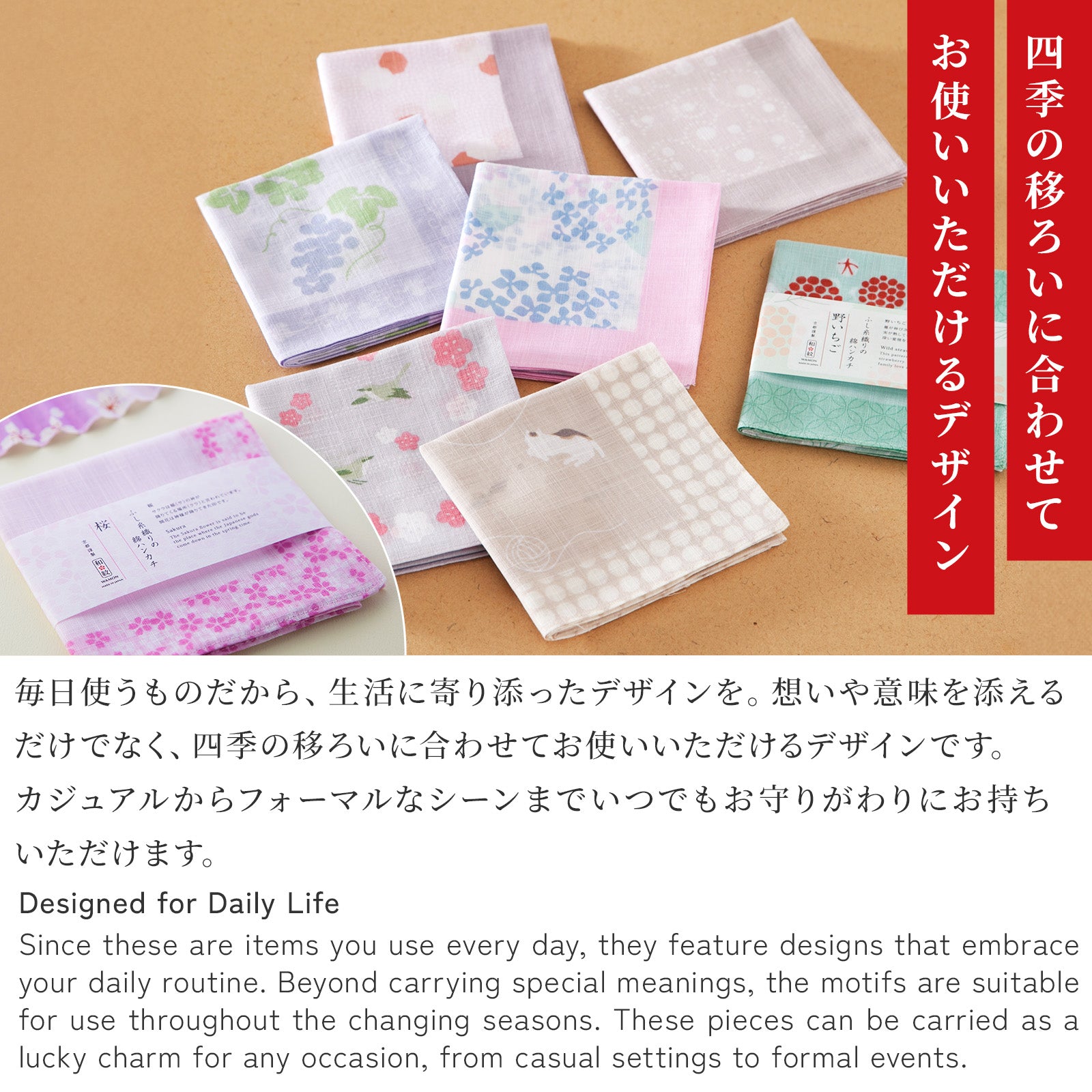 四季の移ろいを映す花々や縁起のよい動物、古典文様をさりげなくデザインに取り入れ、日常使いから特別なシーンまで幅広くお使いいただけます。お守りのように持ち歩ける一枚として、また大切な方への贈り物にもおすすめです。