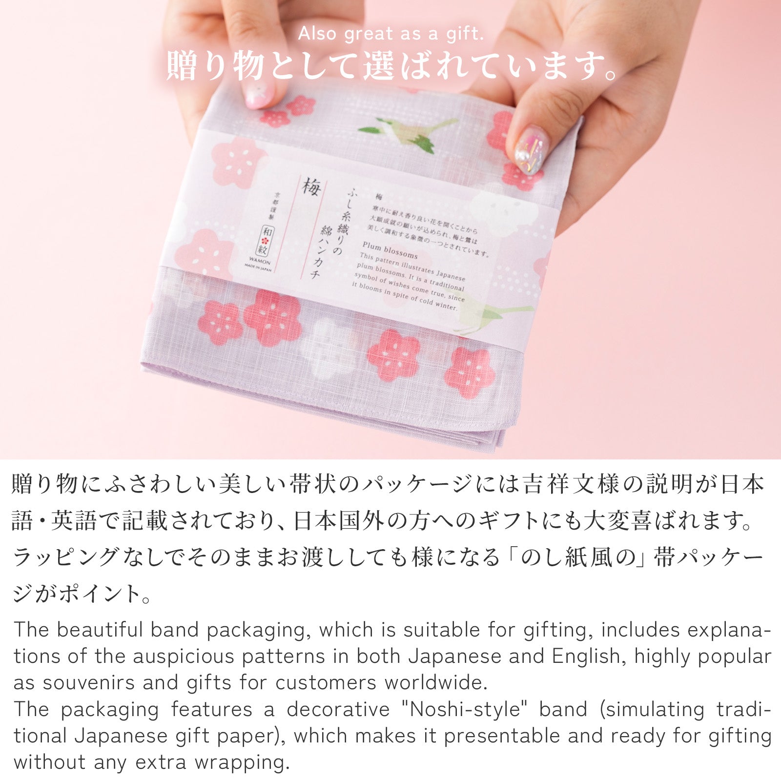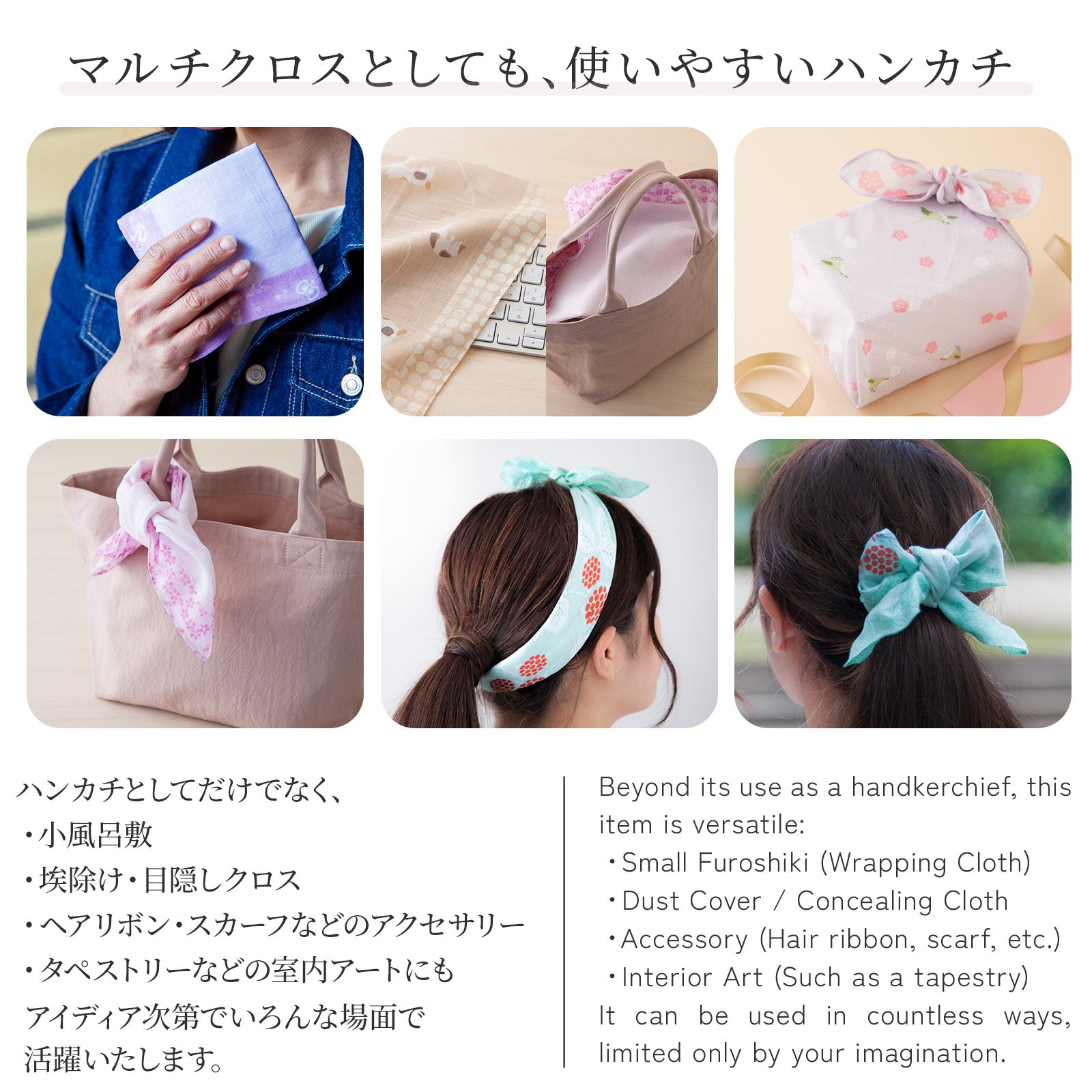 吉祥文様とは、繁栄や長寿、幸福などの願いを込めた文様のこと。桜や梅などの花々、動物や自然の姿、幾何学的な模様まで、古来より人々は祈りや願いを意匠に込めてきました。このハンカチは、そんな伝統を受け継ぎながらも、現代の暮らしに取り入れやすいデザインに仕上げています。