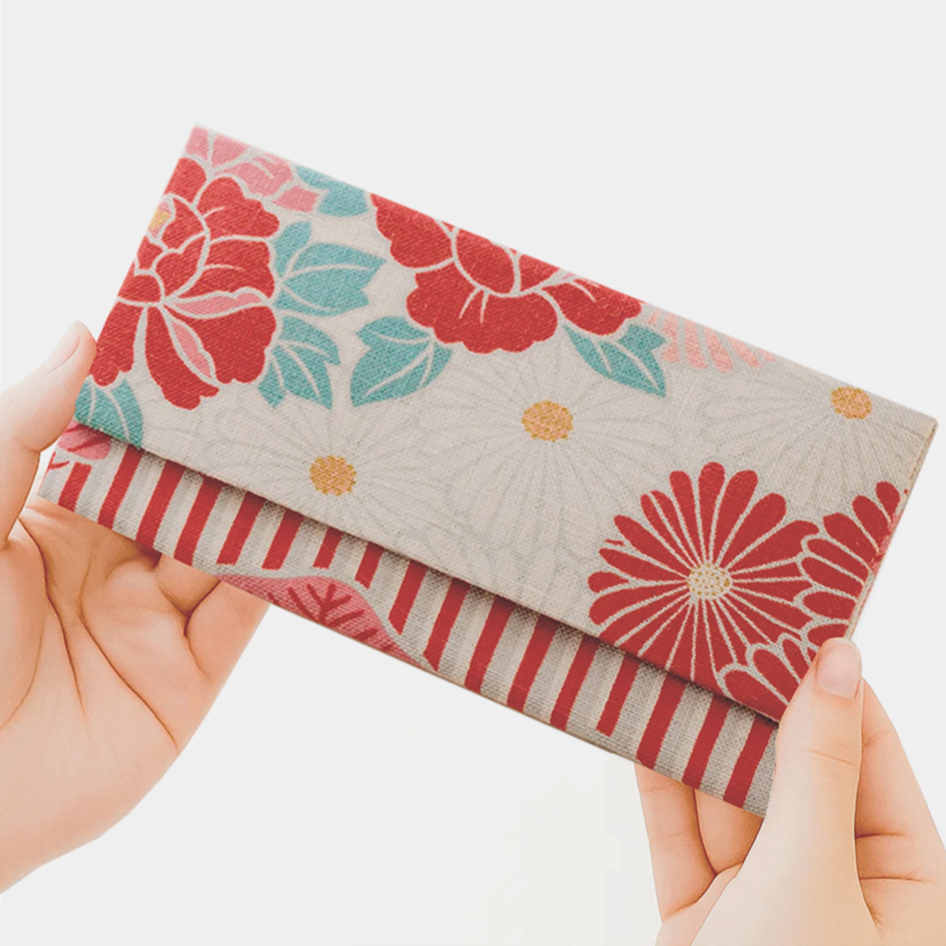 日本の伝統的な染色技術と現代のデザインを融合させた、のレンオリジナルのテキスタイル。細部まで丁寧に描かれた菊や牡丹の花々が、華やかで品のある雰囲気を醸し出します。ストライプ柄がデザインを引き締め、甘すぎないモダンな印象を与えます。薄型でかさばらないのが特徴で、お茶席の際には着物の帯のお太鼓の中にすっきりと収まります。お懐紙・黒文字・扇子など、必要最低限なものをスマートに持ち運ぶことができます。