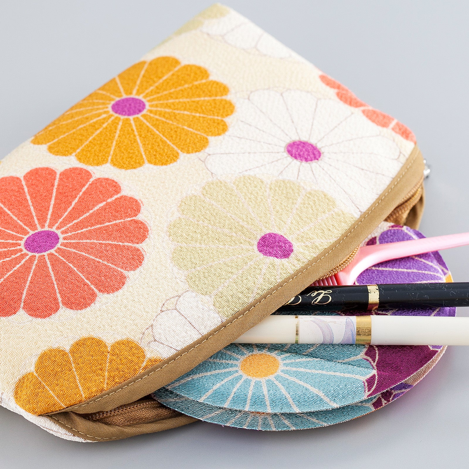 のレンオリジナル「菊華」柄の化粧ポーチは、日本の美意識をぎゅっと詰め込んだ、レトロで気品あふれるデザインが魅力です。伝統的な菊の花をモチーフに、丸みを帯びた優雅な花々を華やかに散りばめました。バッグに入れてもかさばらないスリムな形状ながら、見た目以上の収納力を備えています。ファスナーはそれぞれの生地に合わせた上品な色を選んでおり、統一感のあるデザインに仕上げました。