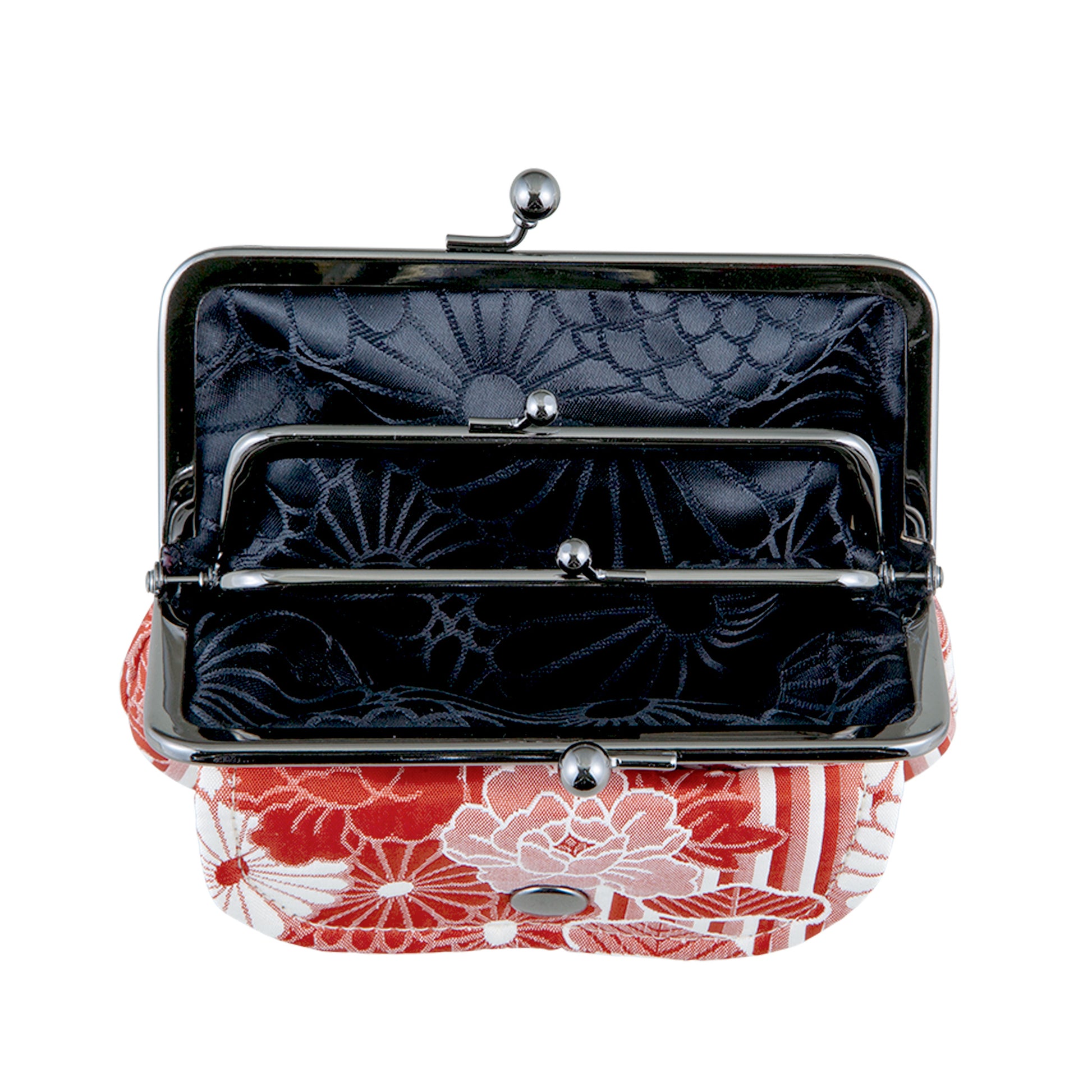 外側のがま口を開けると、内側にもう一つの口金つきポケットが現れ、3つのスペースに仕分けできます。