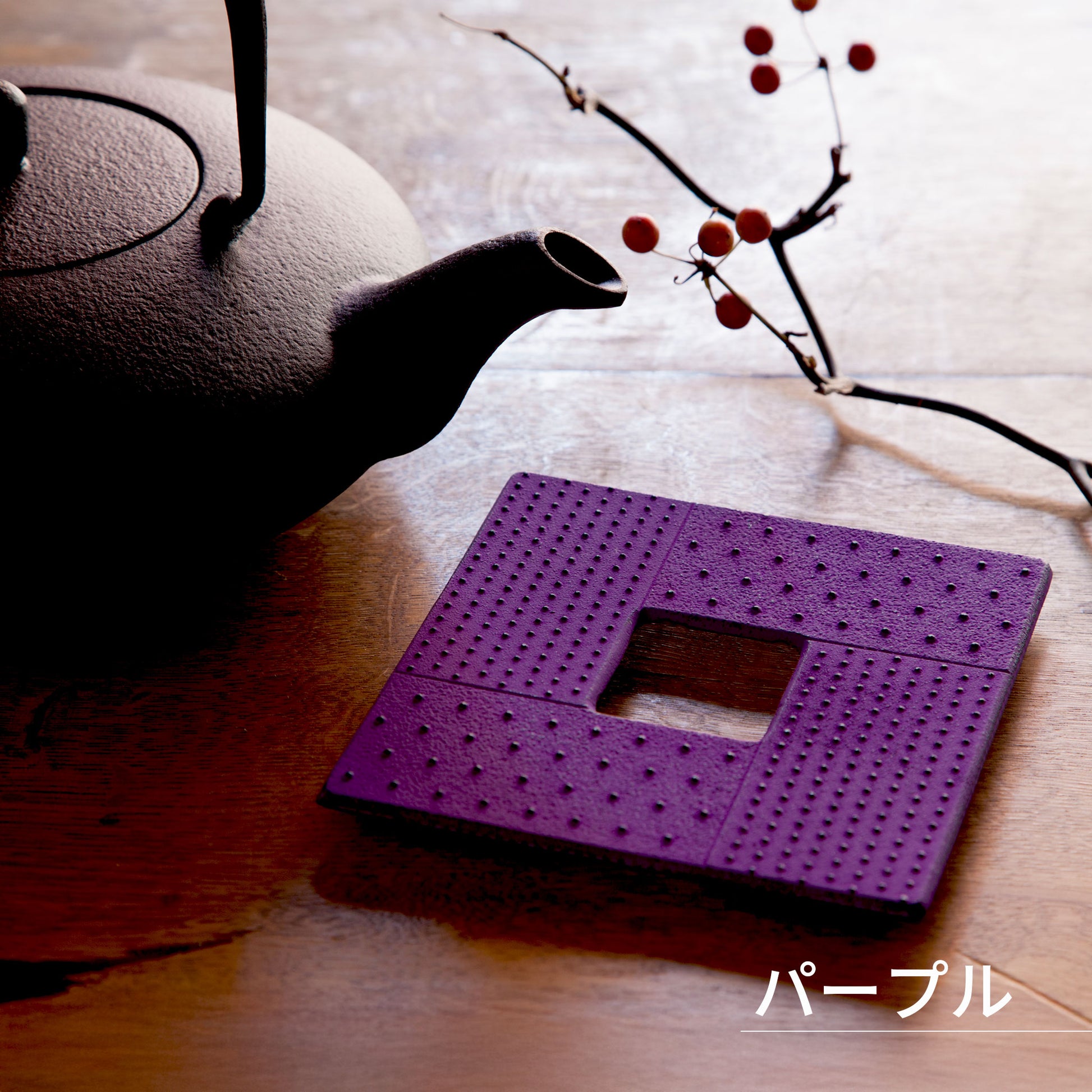深みのある紫が醸し出す、クールで優雅な印象。テーブルに静謐な存在感をもたらし、日常の時間をぐっと引き締めます。さっぱりとした和菓子や、モダンなティーセットと合わせると、洗練された大人のティータイムに。日常使いにも馴染みやすく、季節の移ろいを感じさせてくれるような奥深く落ち着いた色使いです。