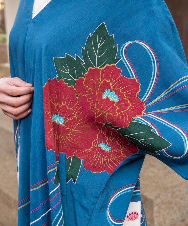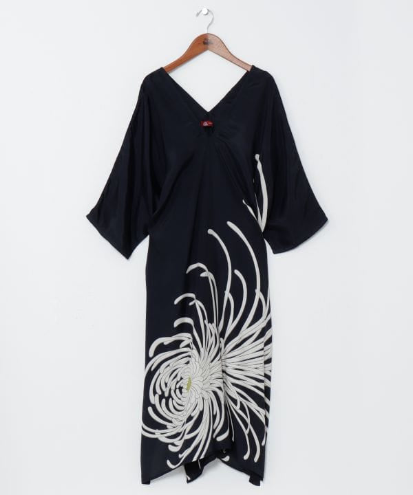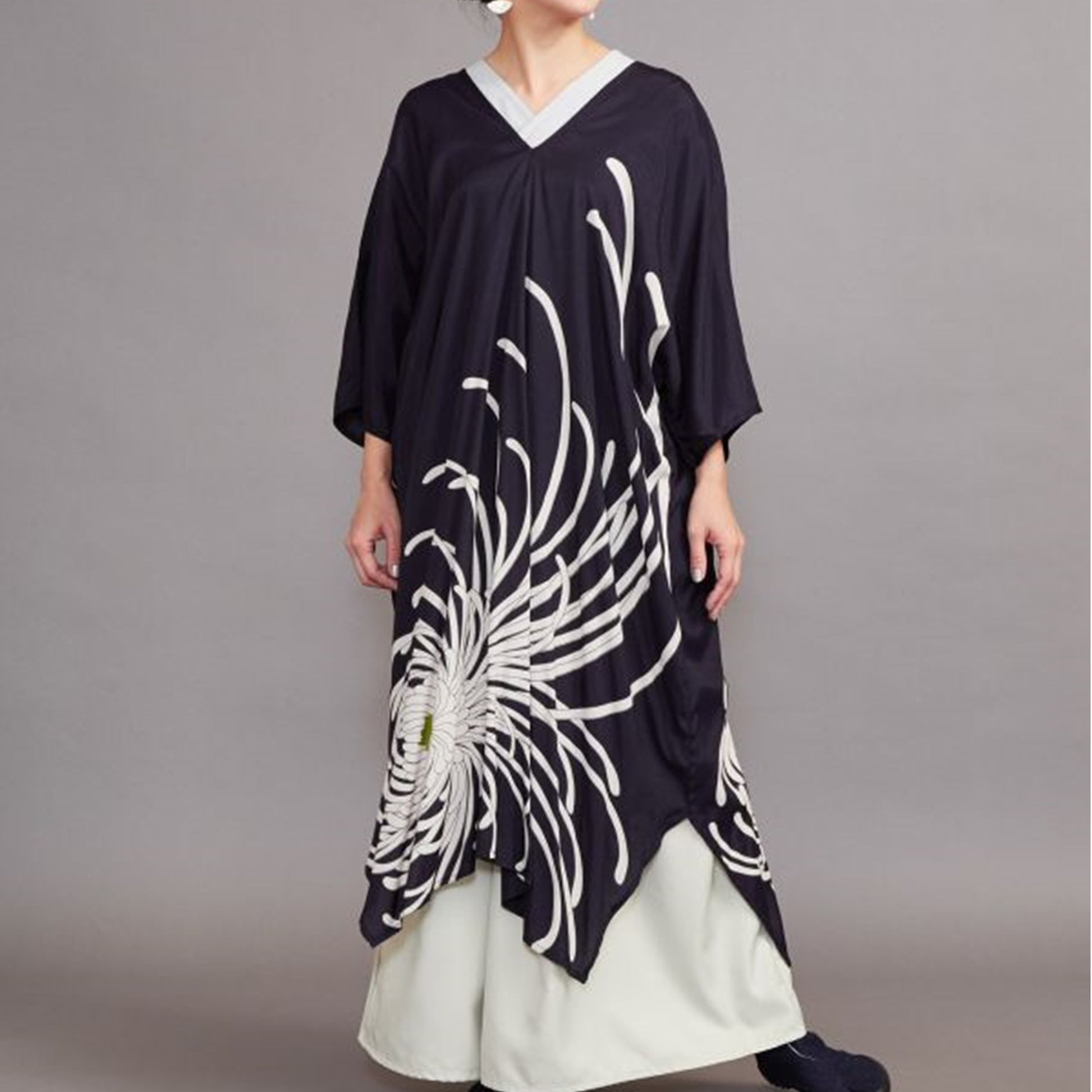 発展や繁栄の象徴である扇と、日本の国花としても親しまれる菊、長寿の象徴である薬玉、生命力の象徴の鶴を大胆にプリントした華やかな祝賀ワンピース。