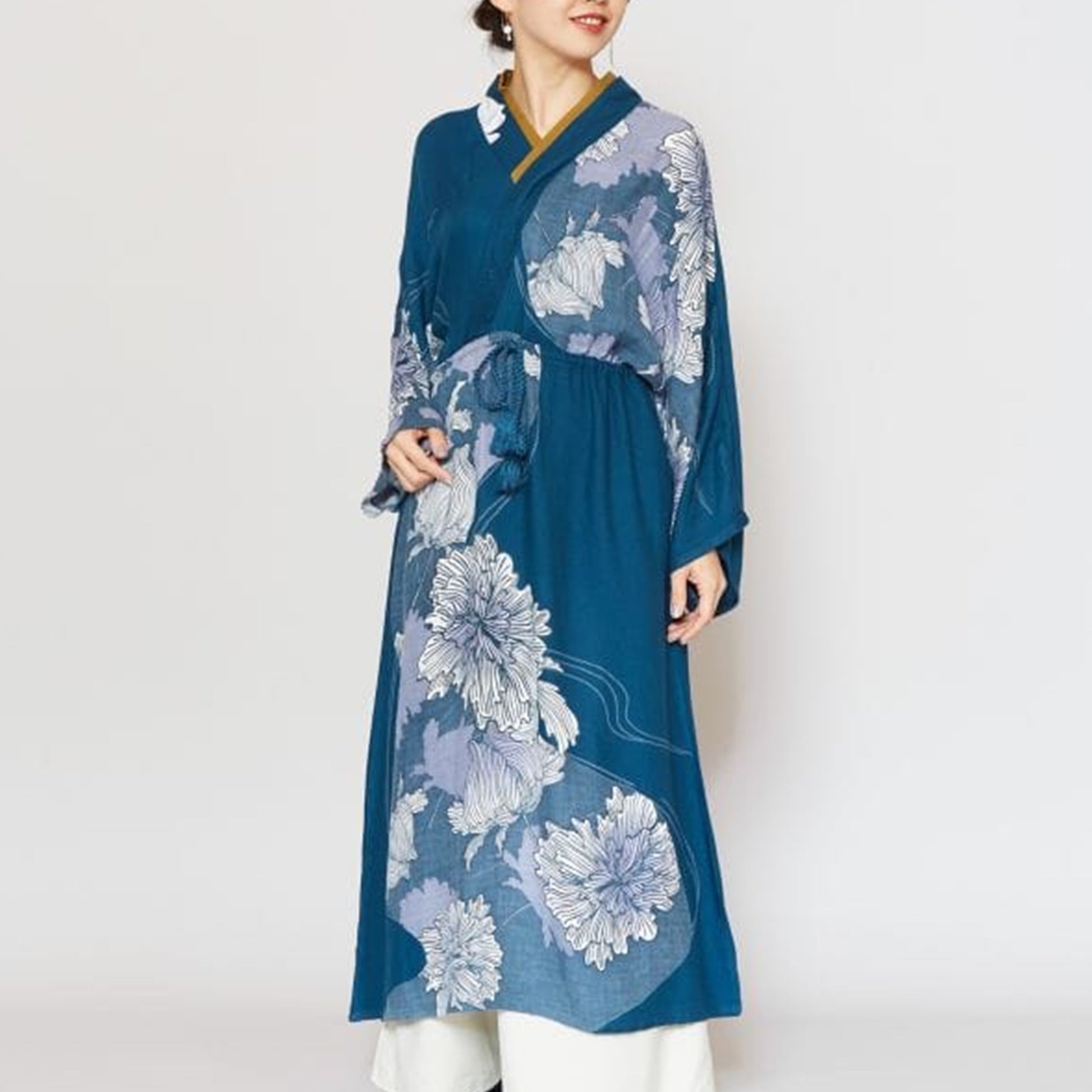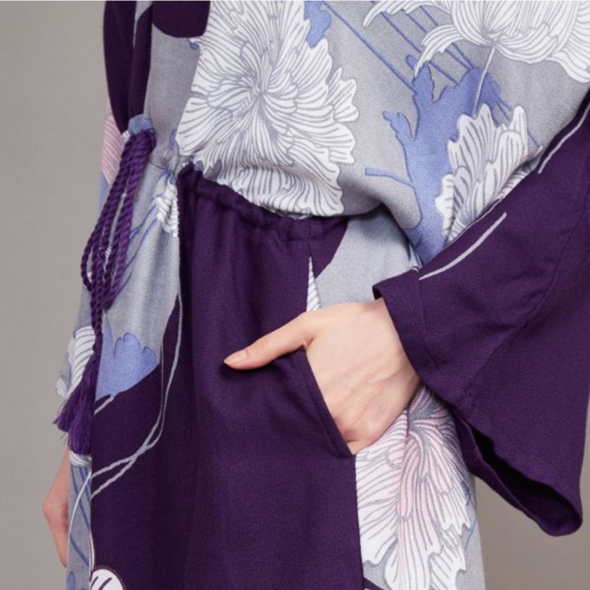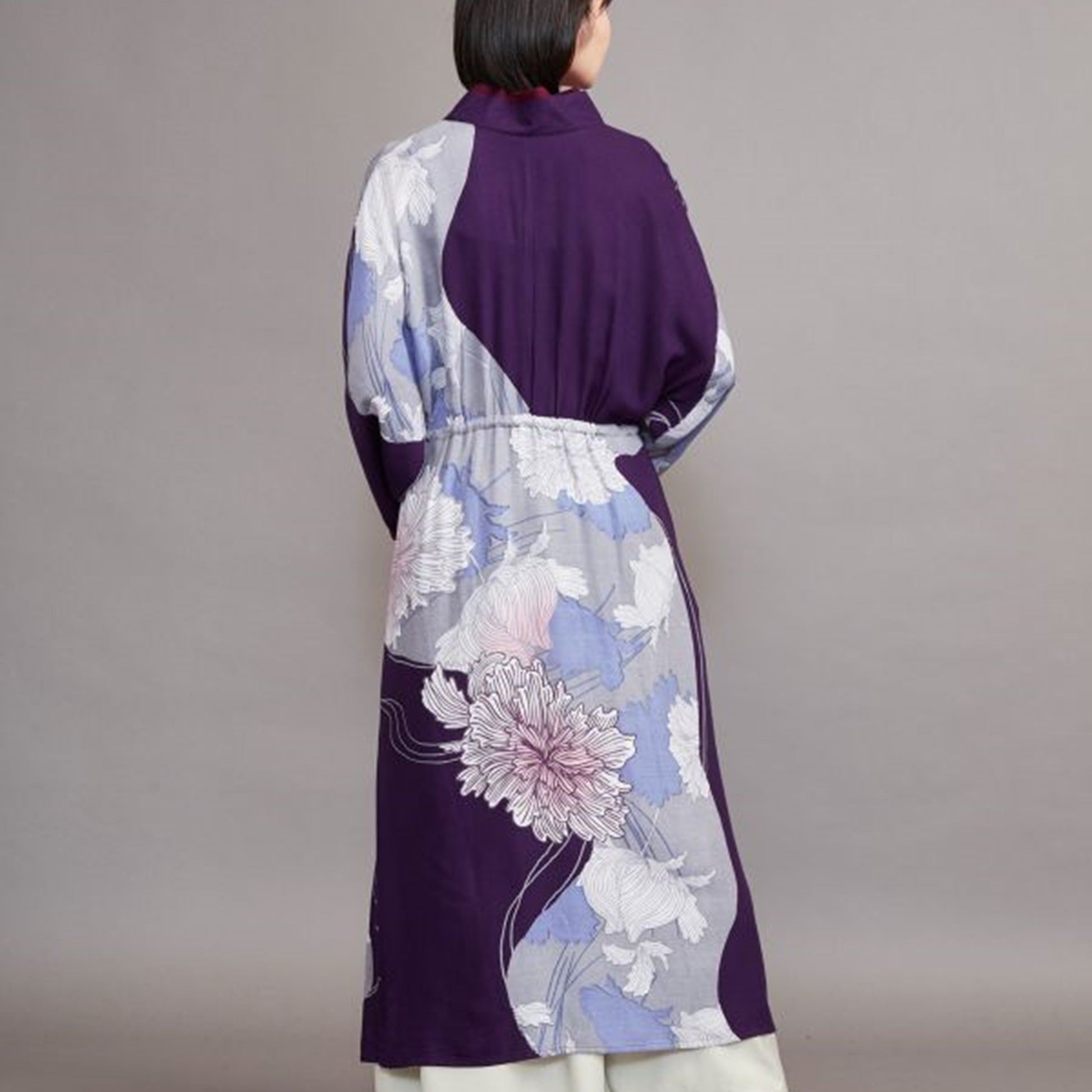 衿元や袂の形にこだわった着物のようなシルエットが、モダンでエレガント