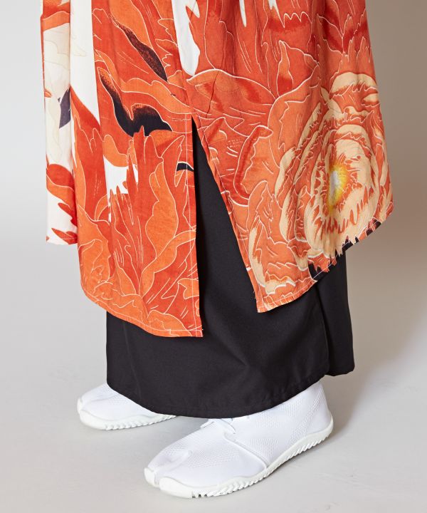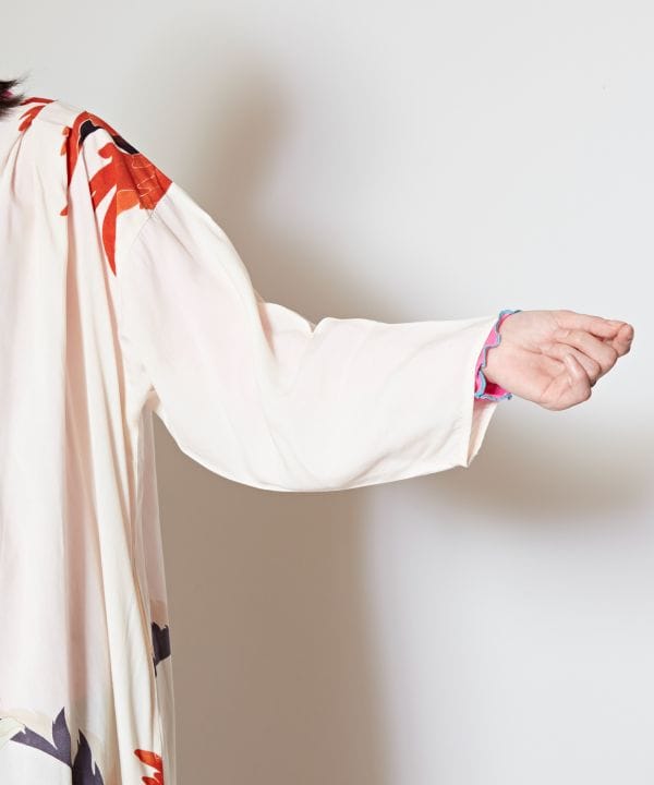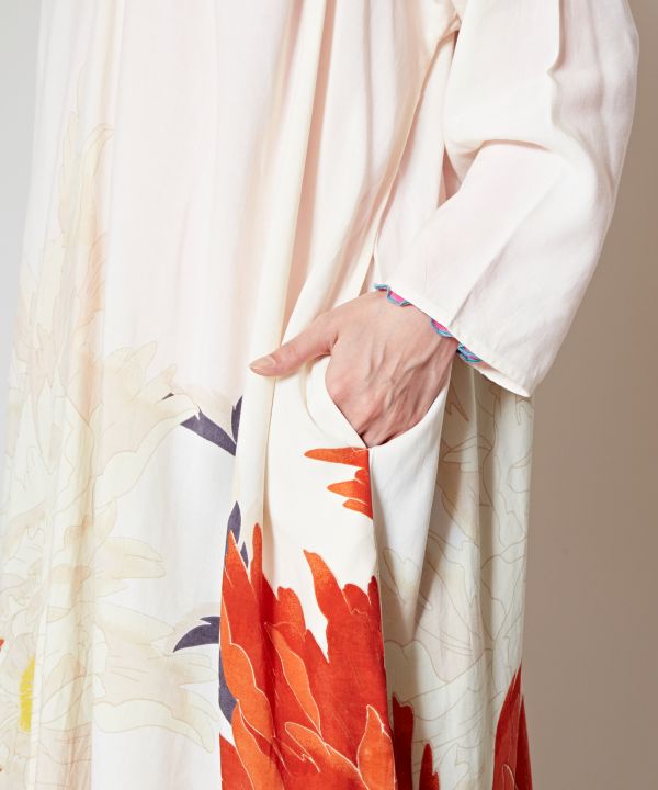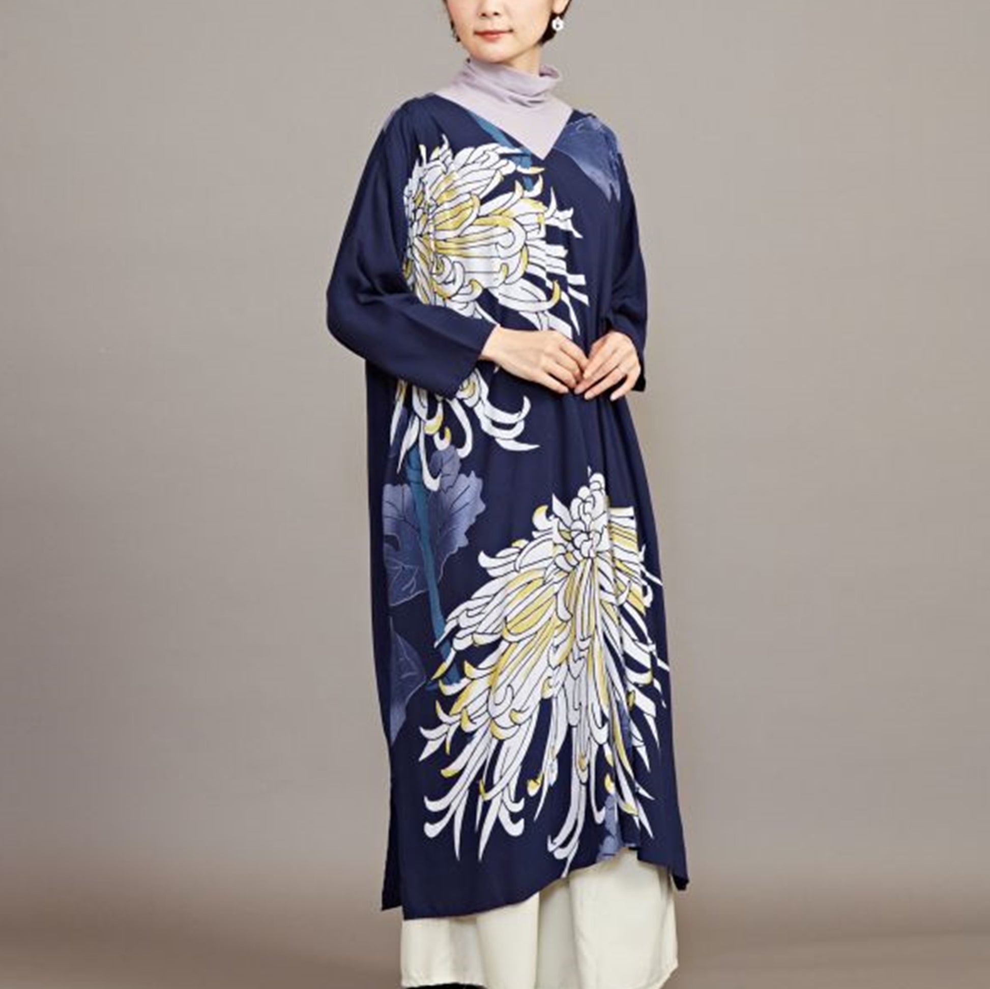 縁起のいい尾長鳥、菊、扇をモチーフにして自然の美しい風景を表した花鳥風月のワンピース