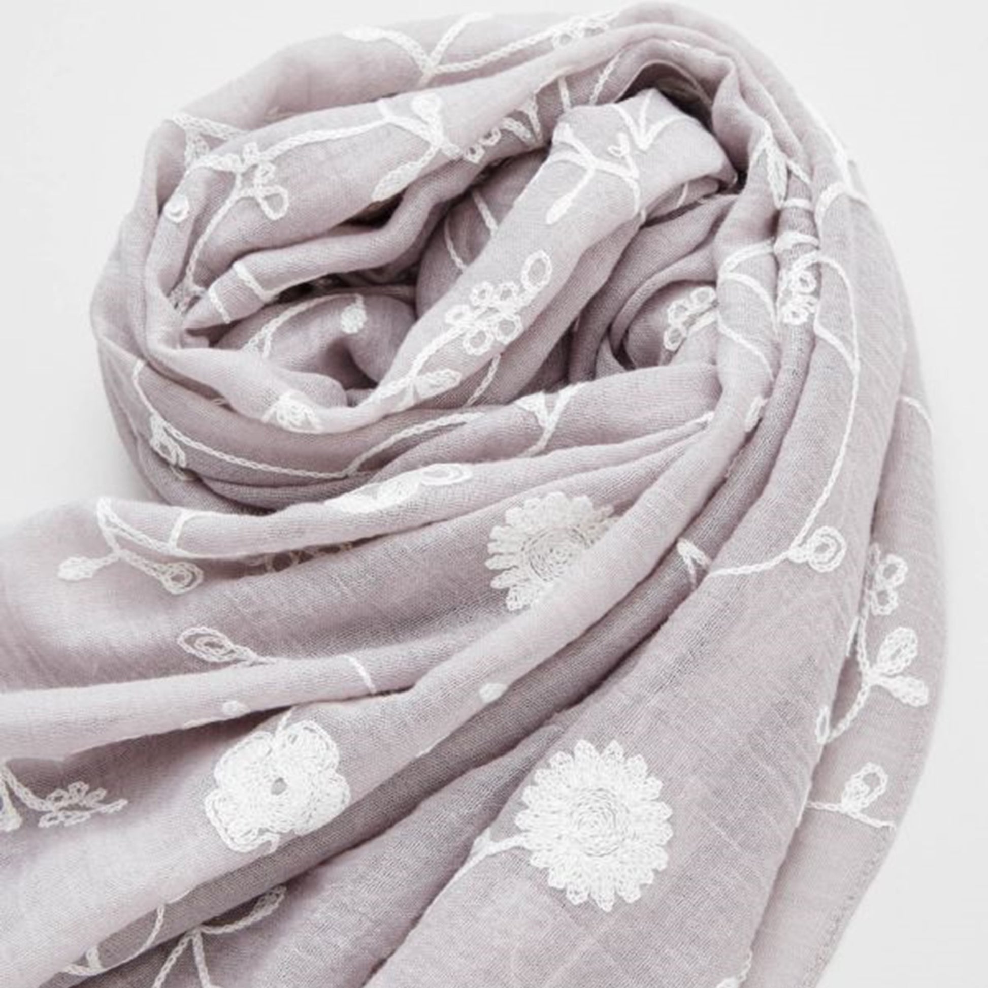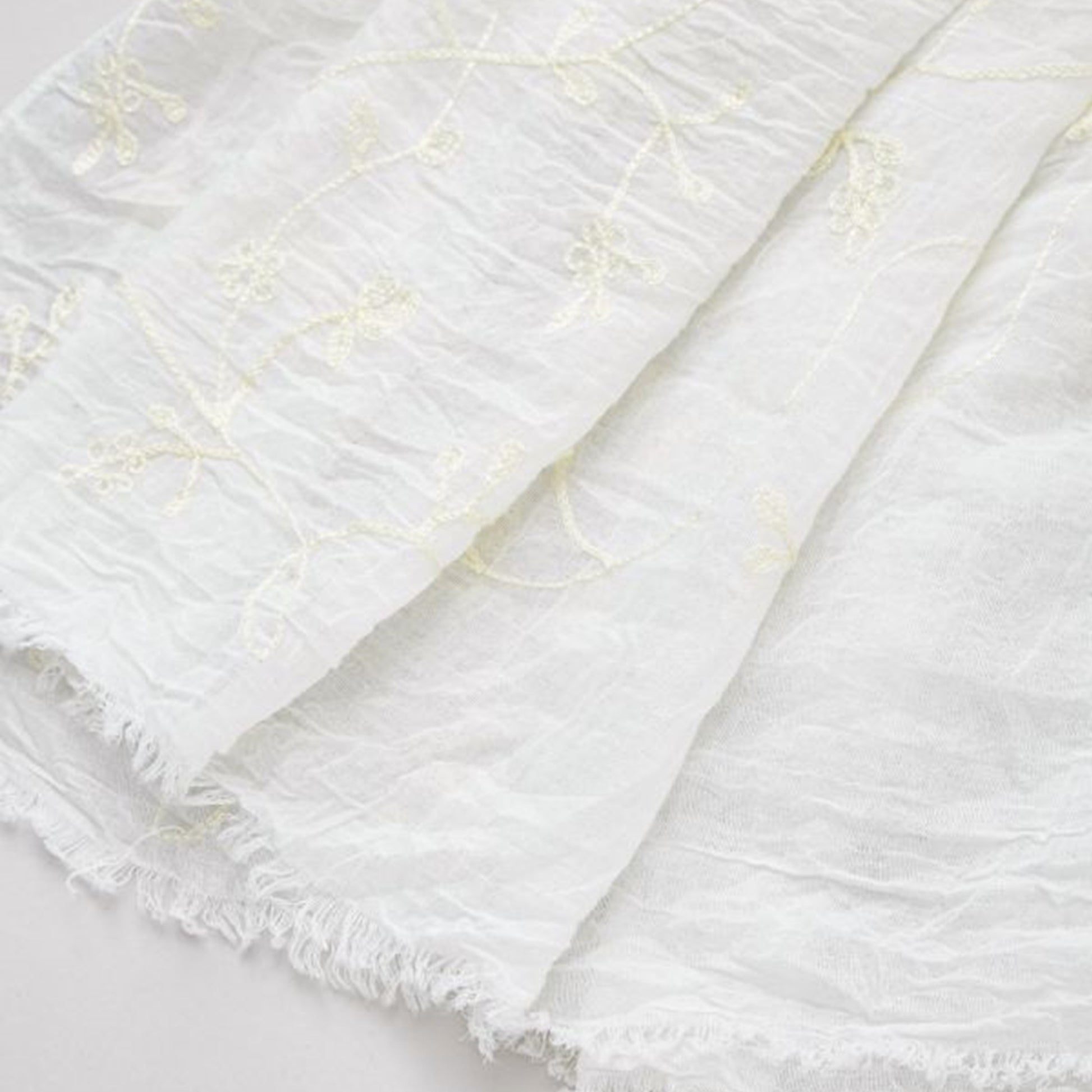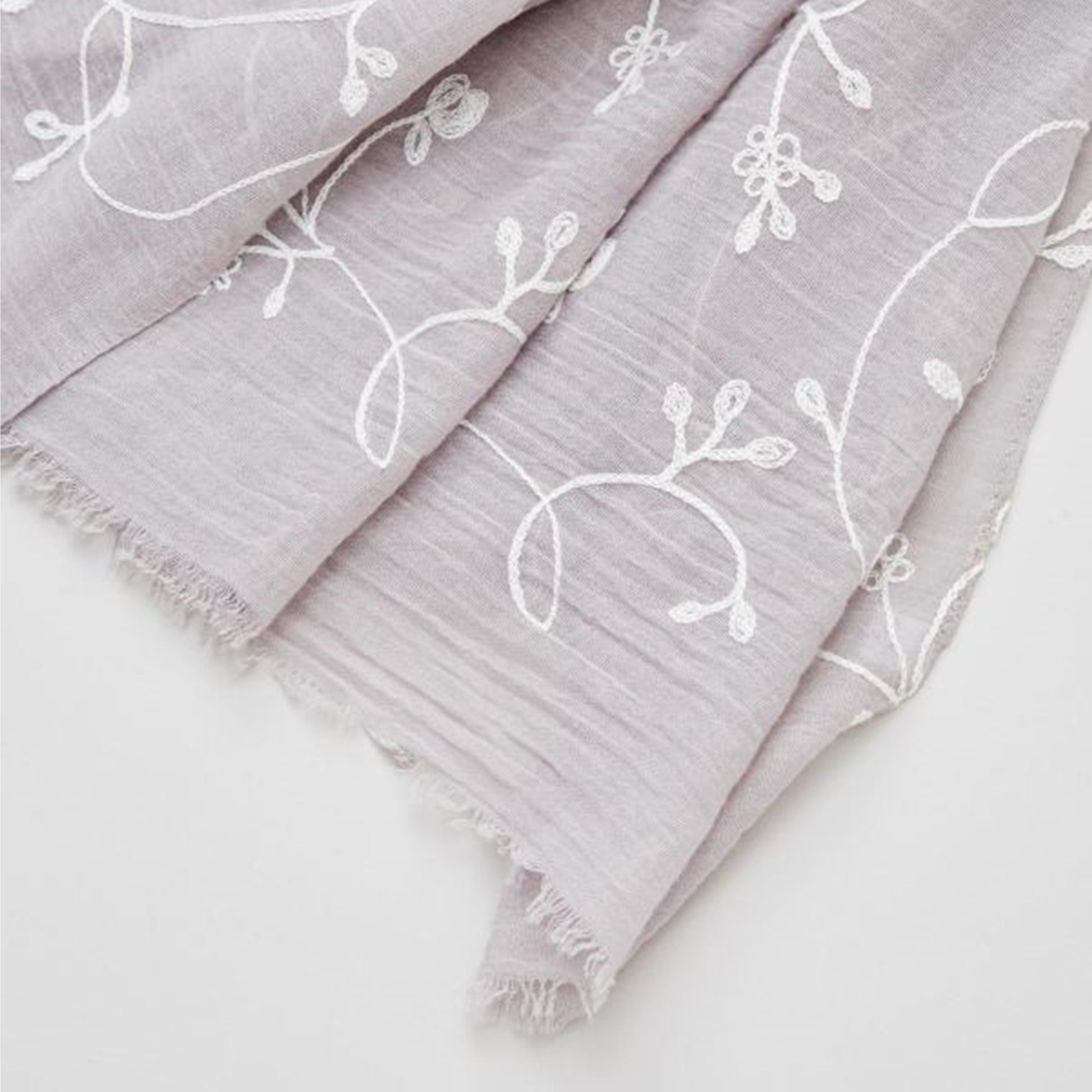 花柄の流れるような刺繍が温もりを感じる春らしいストールです。