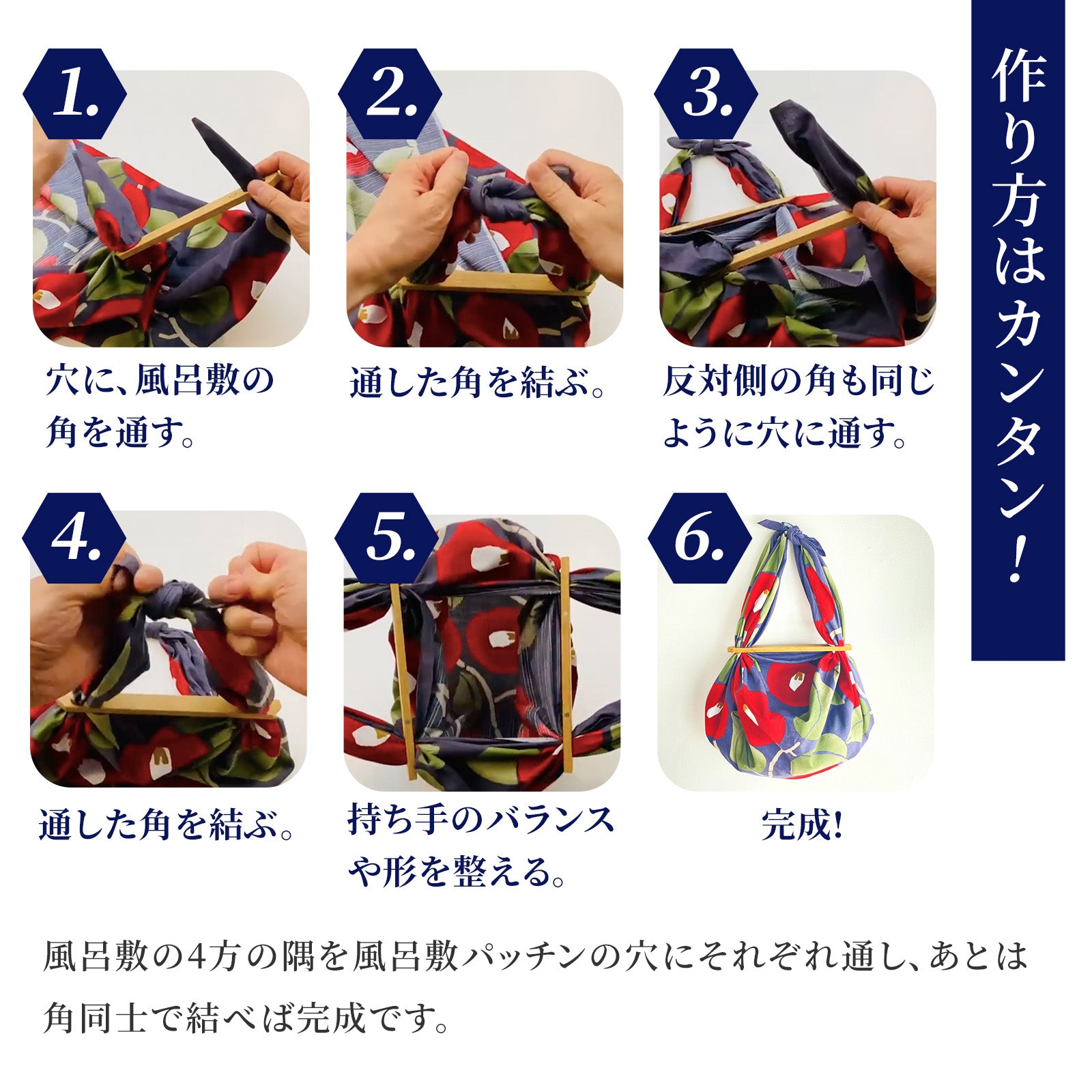 「風呂敷パッチン」の使い方は、本当にシンプル。風呂敷の四隅をパッチンの穴に通し、それぞれ結ぶだけで、あっという間におしゃれな風呂敷バッグが完成します。特別な技術は一切不要。誰でも気軽に、日本の伝統文化を現代のファッションに取り入れることができます。