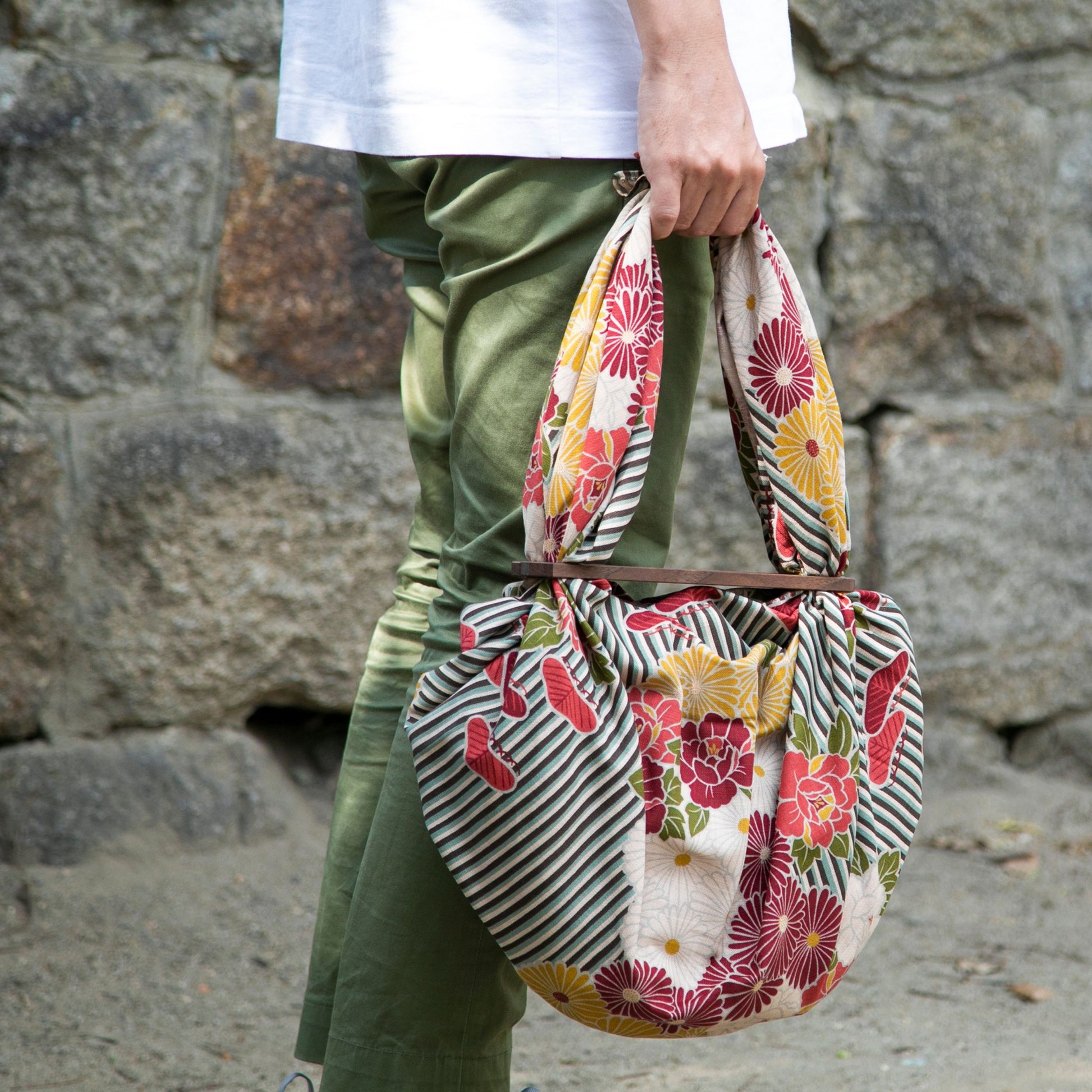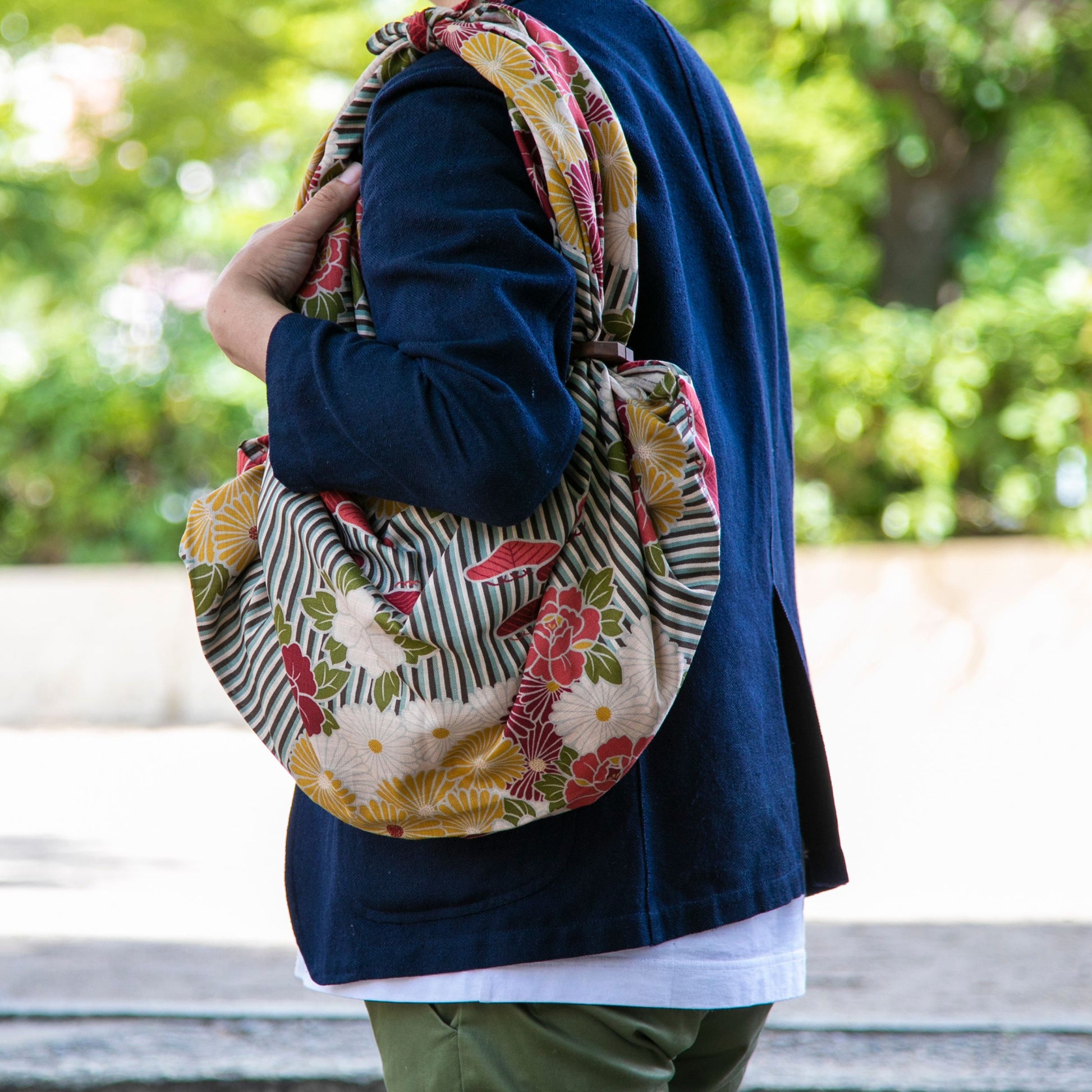また、風呂敷の結び方や通し方を工夫することで、持ち手の長さや形を自由にアレンジできるのも魅力です。肩掛けにしたり、ハンドバッグにしたりと、その日の気分やファッションに合わせて様々な表情をお楽しみいただけます。