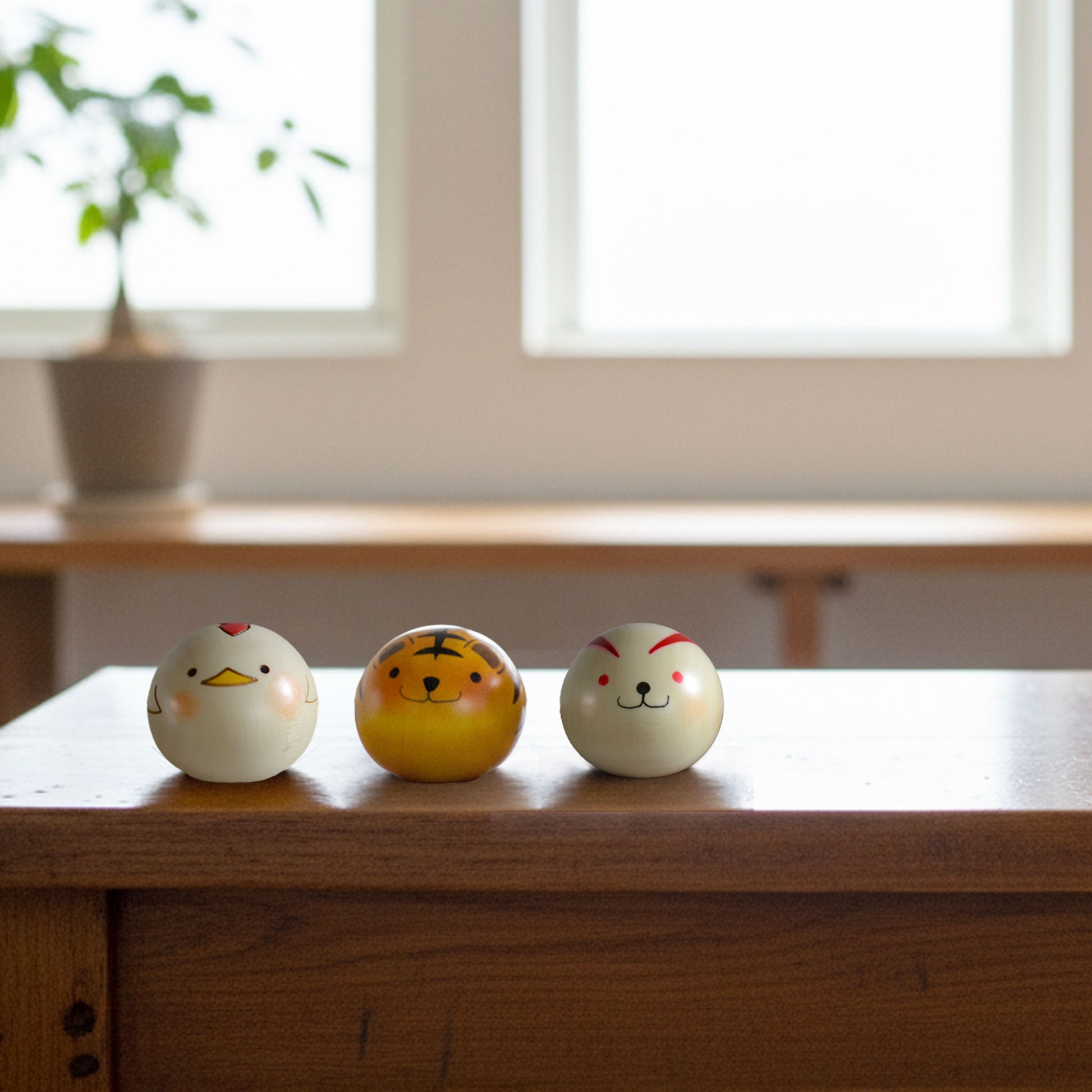職人さんが一体一体、手彫りと色付け。ひとつひとつ丁寧に手描きで描かれた干支の表情に、思わず微笑んでしまうあたたかさを感じます。また、天然木を使用しているため、それぞれに木目や色合い、形の繊細な個性があり、世界に一つだけの風合いを楽しめます。手仕事ならではのぬくもりとやさしい質感が、そっと心を和ませてくれます。