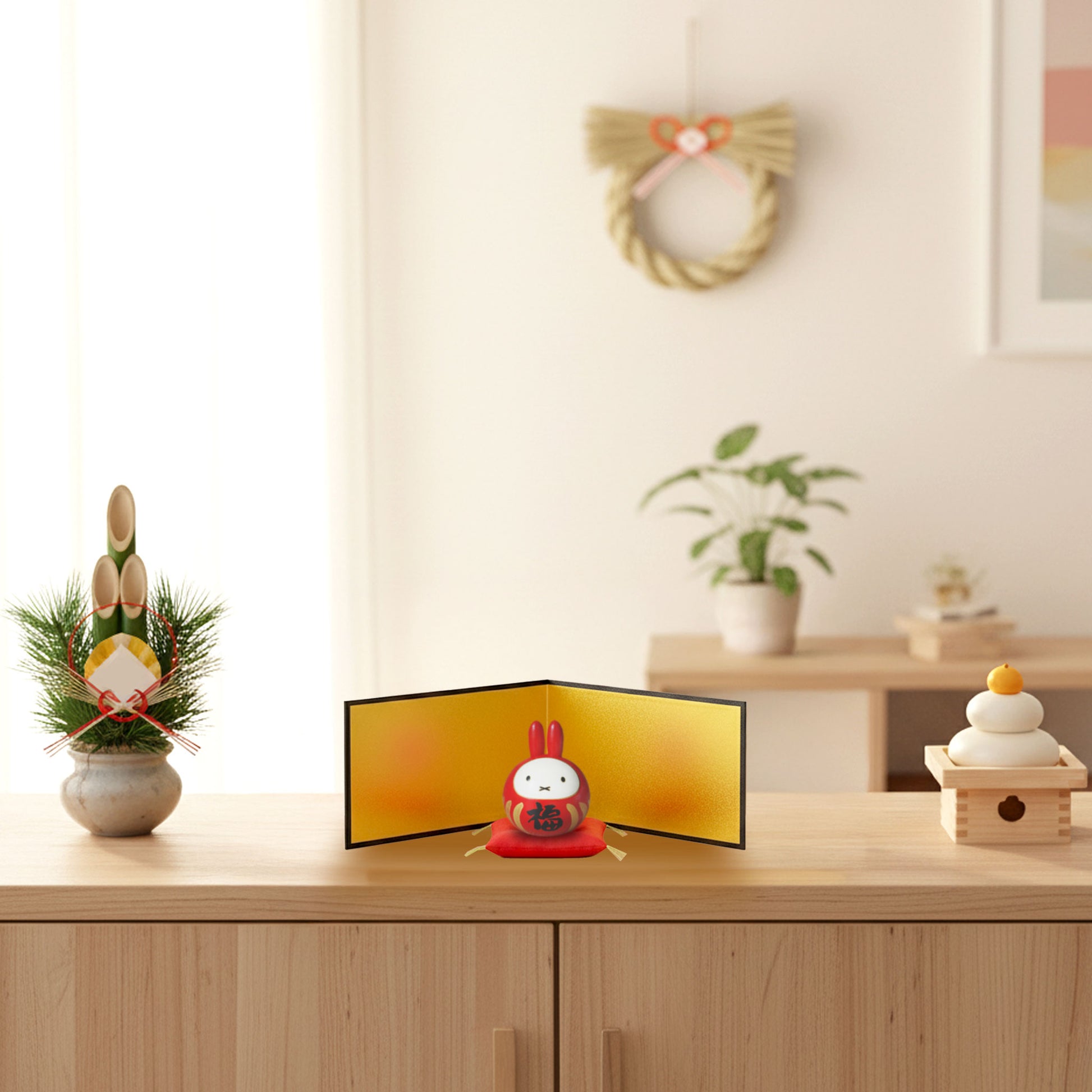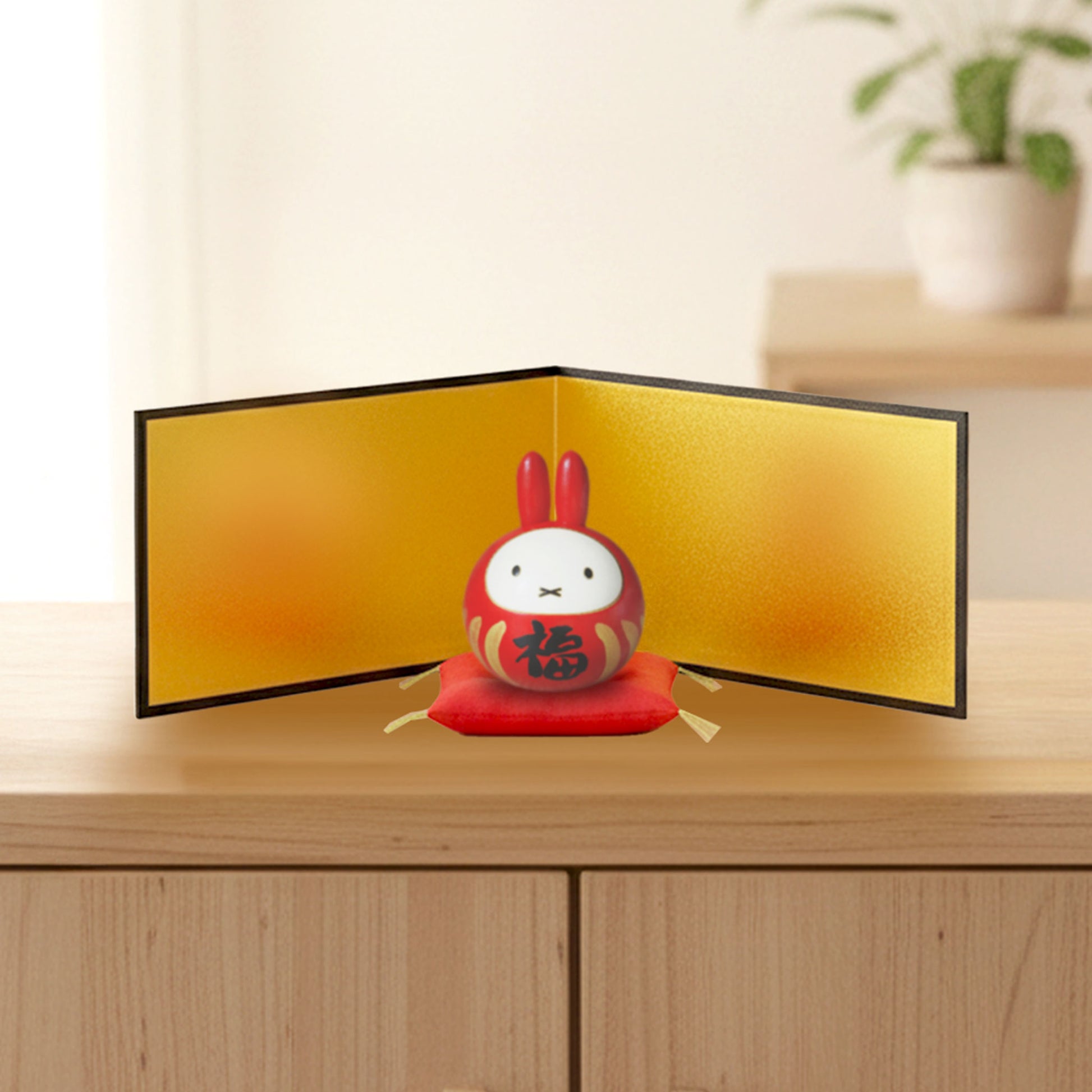 ちょこんと佇む姿が愛らしい、ミッフィーの福だるまこけしを職人さんが手作りで仕上げ、さらに高級綸子(りんず)座布団と金屏風をセットにしました。豪華な飾り台と背景が、こけしをより一層引き立てます。お正月飾りとして、また玄関やお部屋の小さなスペースに、温かな彩りを添えてくれます。