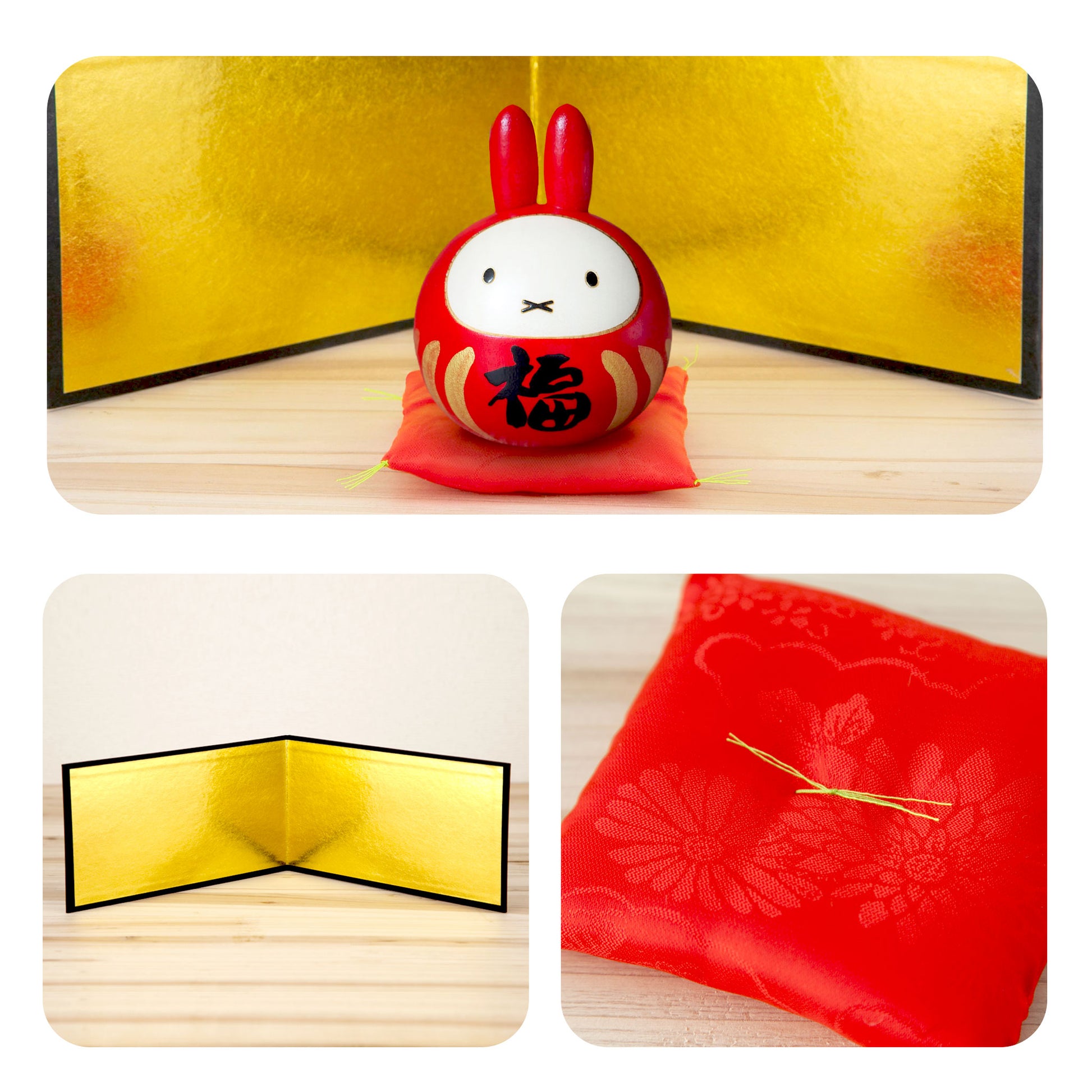 ころんと手のひらサイズのミッフィーと金屏風+座布団セット。お正月だけでなく、一年を通して楽しめる縁起のインテリアです。