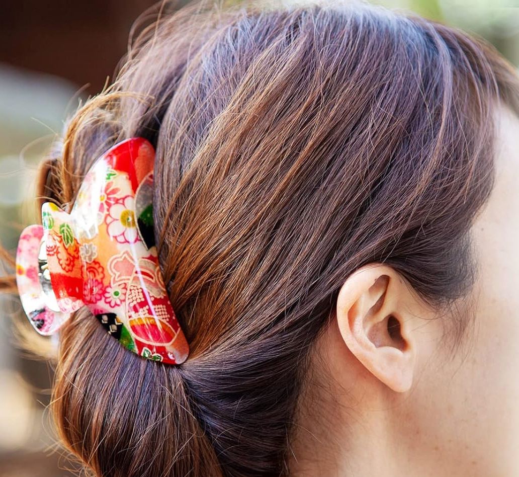 アクリル和布の透明感と艶感が美しいバンズクリップです。大きな口でがっちりと髪を留める事ができ1つ持っておけばさっと髪を纏めたい時に簡単に髪を束ねる事が出来ます。