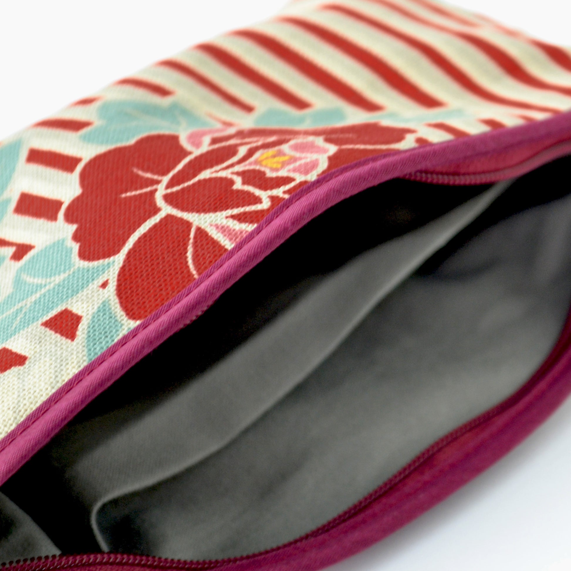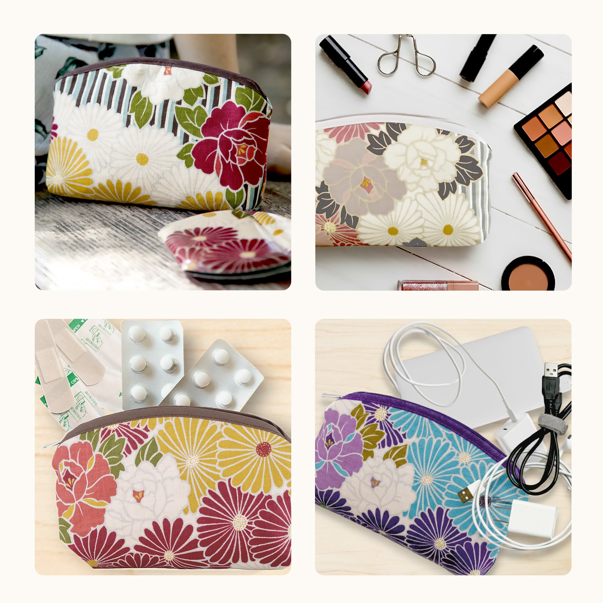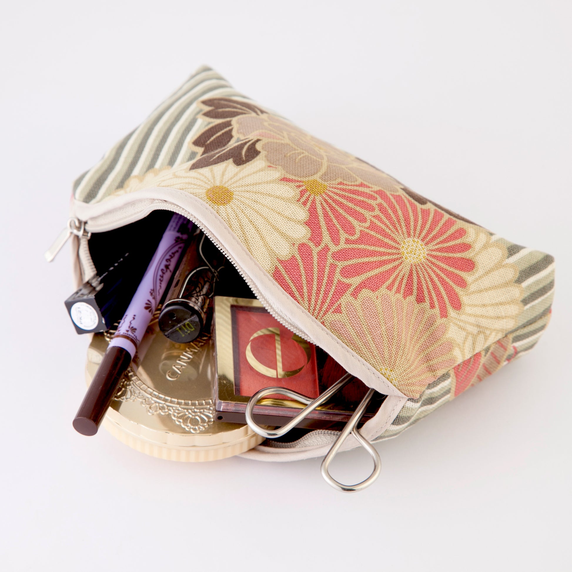 化粧ポーチとして持ち運びに便利なコンパクトサイズ。バッグの中でもかさばらず、必要最低限のコスメをスマートに収納できます。和柄のレトロモダンなデザインは、普段使いはもちろん、和装にもぴったり。着物や洋服に合わせて、さまざまなシーンでお使いいただけます。