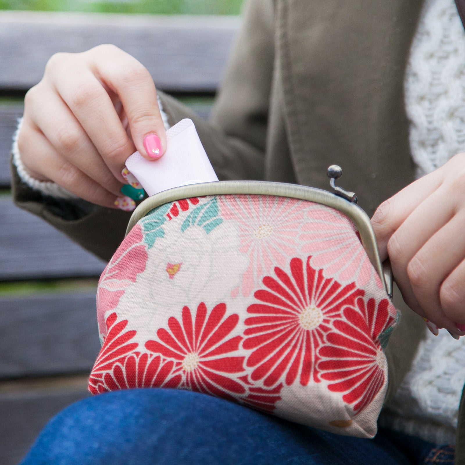 口が大きく開くため、中身がひと目で確認でき、物の取り出しや収納がスムーズ。パチっとしっかり閉まる安心感のある口金で、バッグの中でも中身が飛び出す心配がありません。
