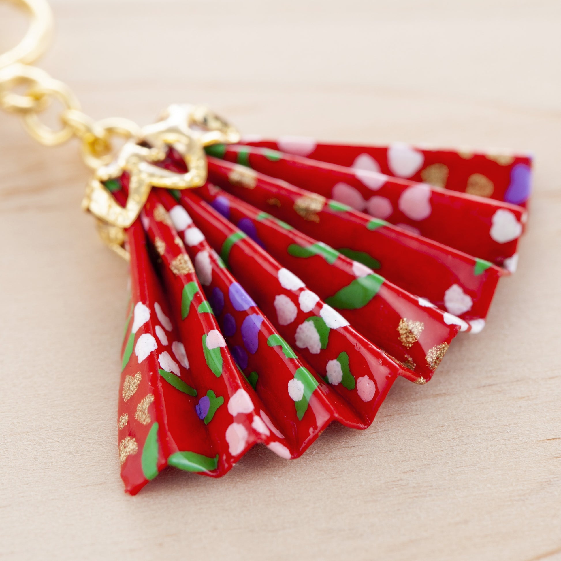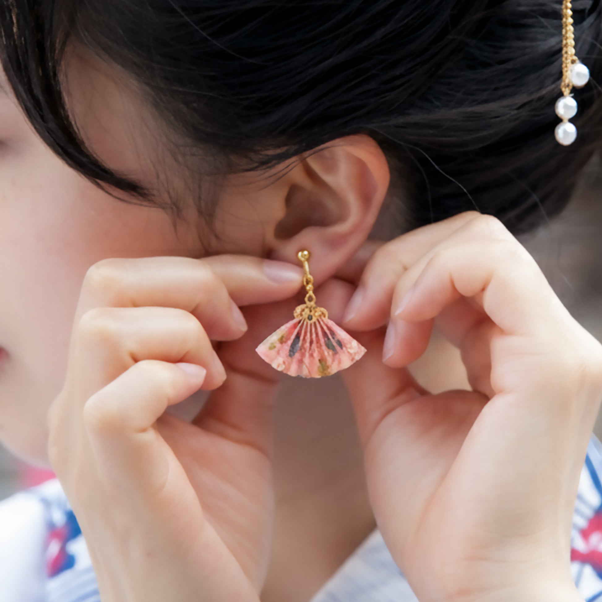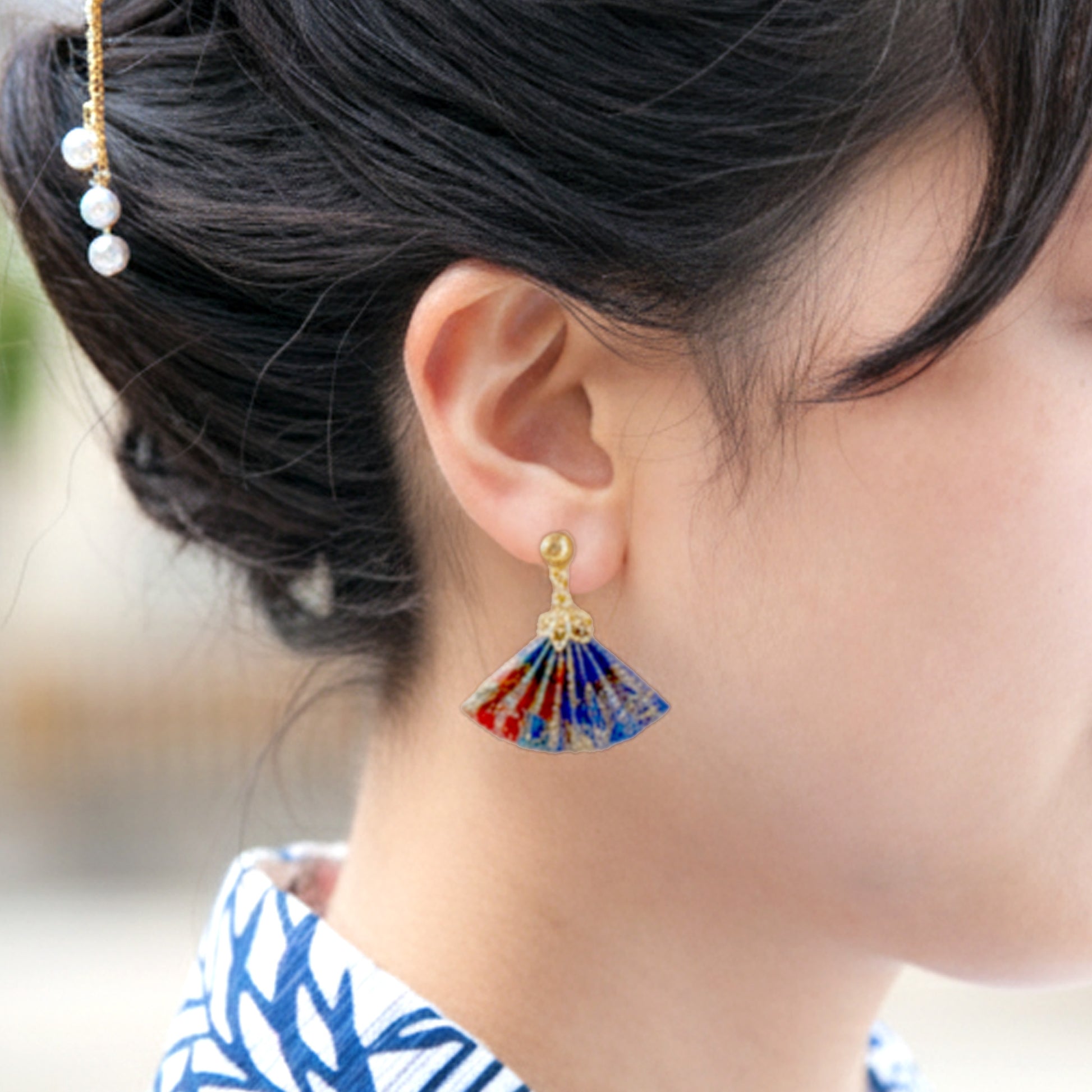 小さな折り紙から作られたのレンオリジナルの手作り扇型の和風ピアス。鮮やかな和紙を用いた美しい仕上がりは、普段使いはもちろん、浴衣や着物などの和装スタイルにも品格を添えます。耳元でゆらゆらと揺れる姿は、まるで小さな扇が優雅に風をはらむように上品で粋な印象を与えてくれます。