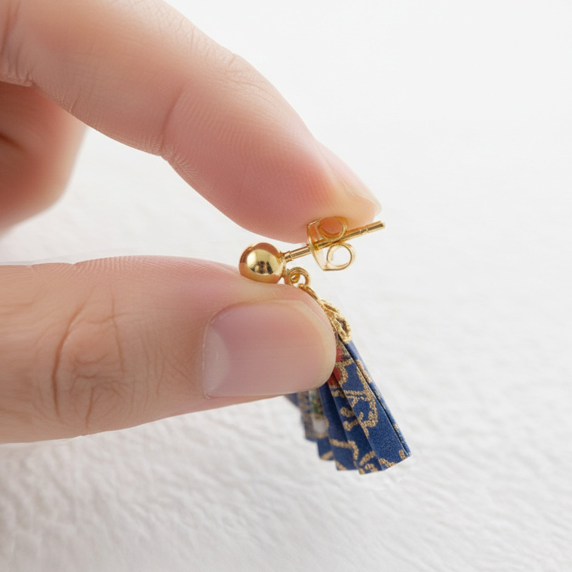 この折り紙ピアスのモチーフは、わずか3cmほどの小さな扇です。機械では折ることができない、この繊細で細かな作業は、日本の熟練した職人が一点一点手作業で丁寧に折り上げています。そのため、大量生産はできないものの、職人の心がこもった一点ものの商品となっています。コロンとした折り紙モチーフが、耳元で愛らしく揺れるのが魅力です。