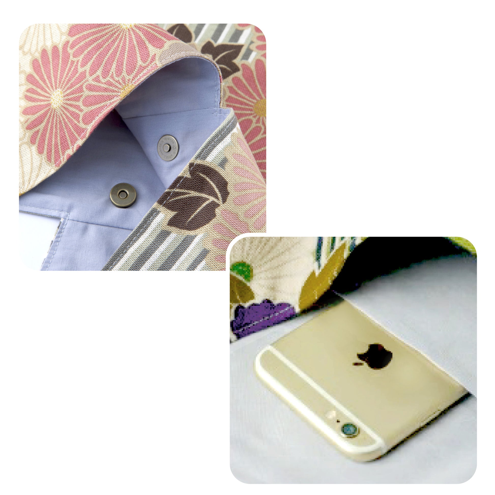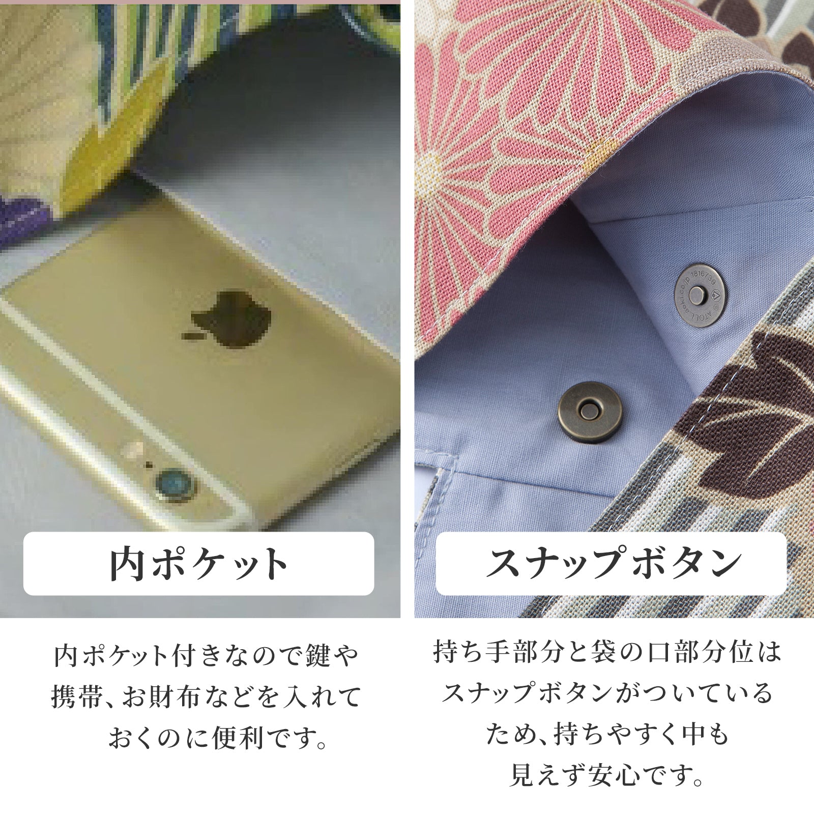 バッグの口を閉じられるように、マグネット式のボタンを備えています。風呂敷バッグだと、中身を見られることが気になることがありますが、この東袋であれば安心です。