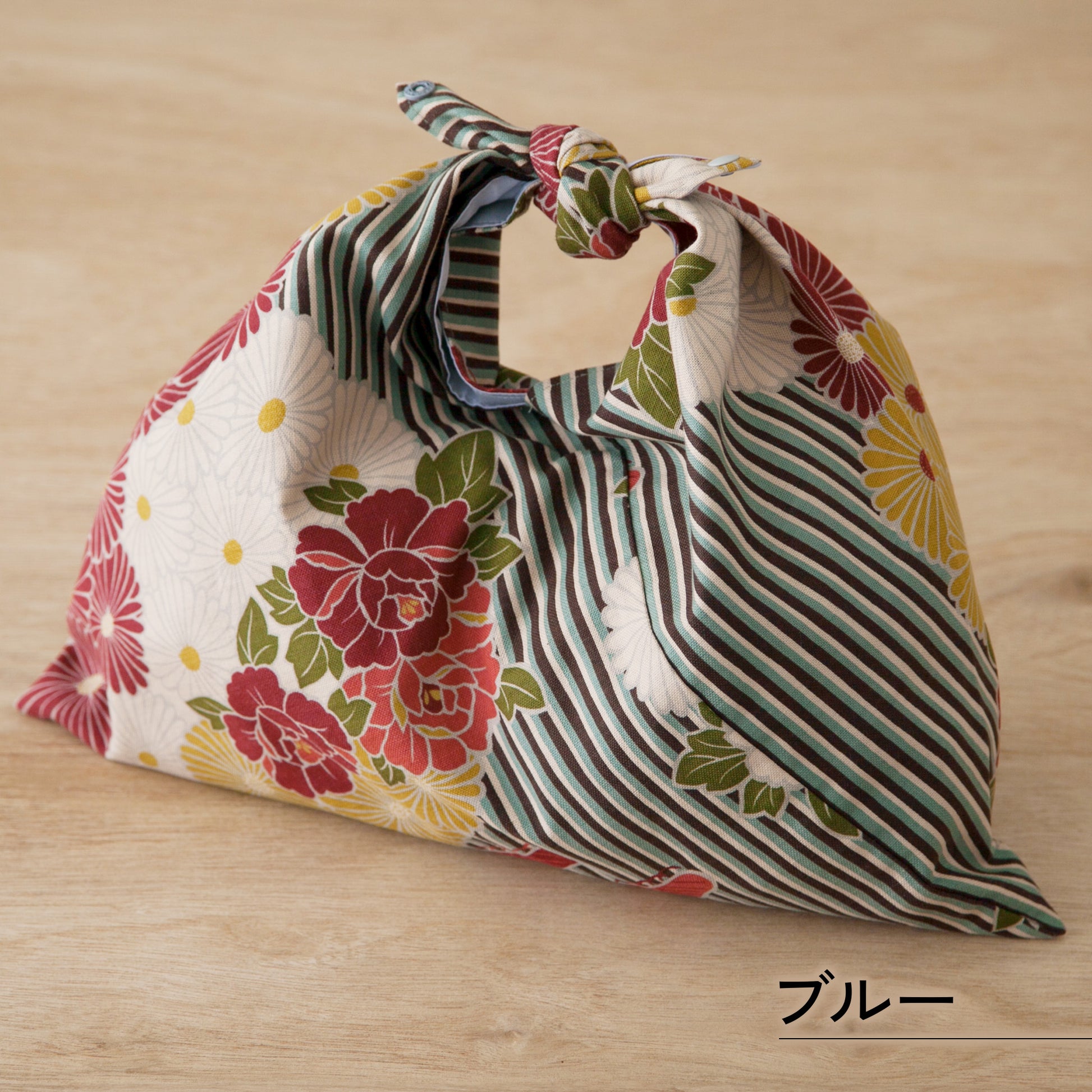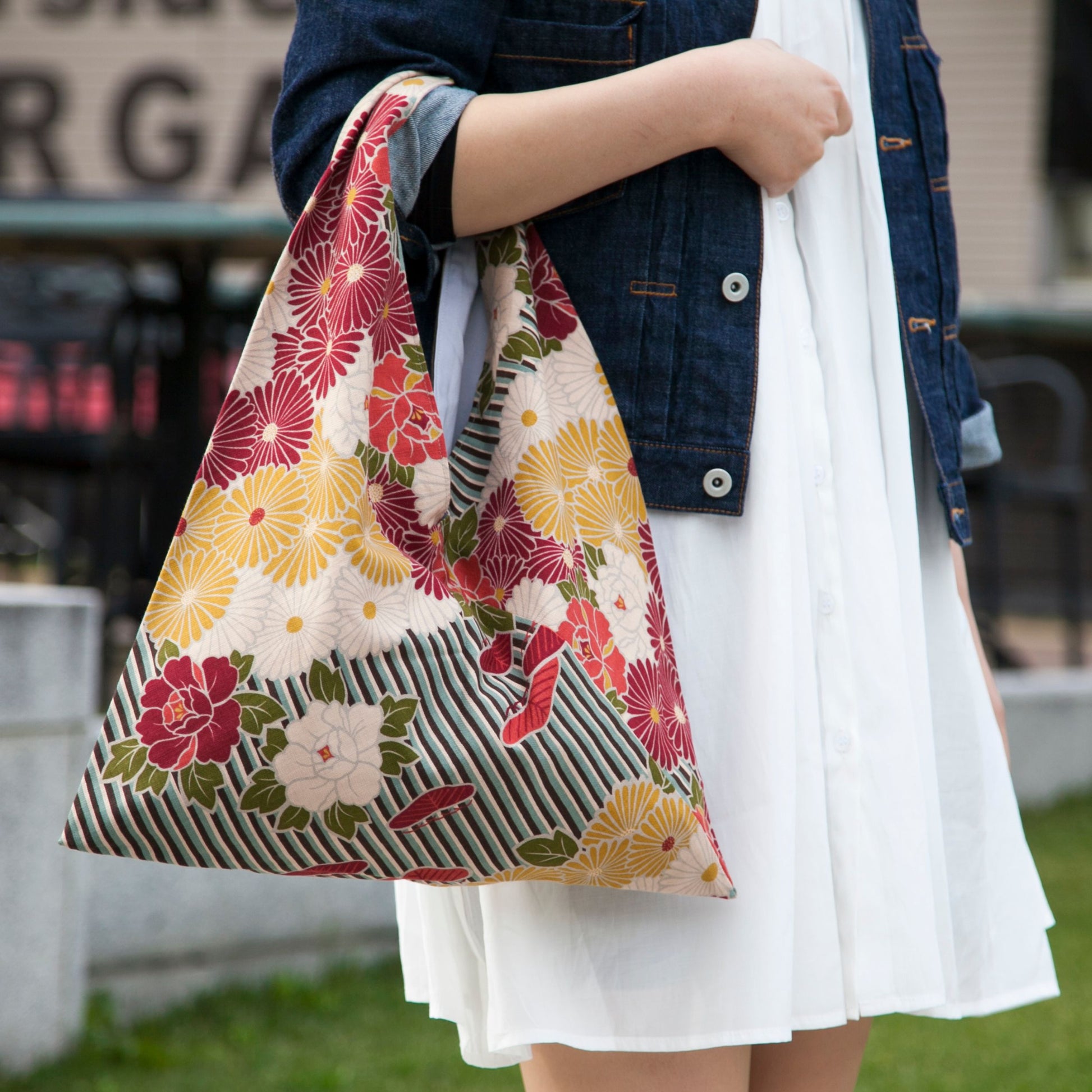 のレンオリジナルのファブリック「レトロフラワー」を一枚の風呂敷から丁寧に縫い合わせた東袋は、持つたびに心が躍るはず。カジュアルな装いにも品格をプラス。これひとつで、お出かけをもっと楽しく、もっと特別に。