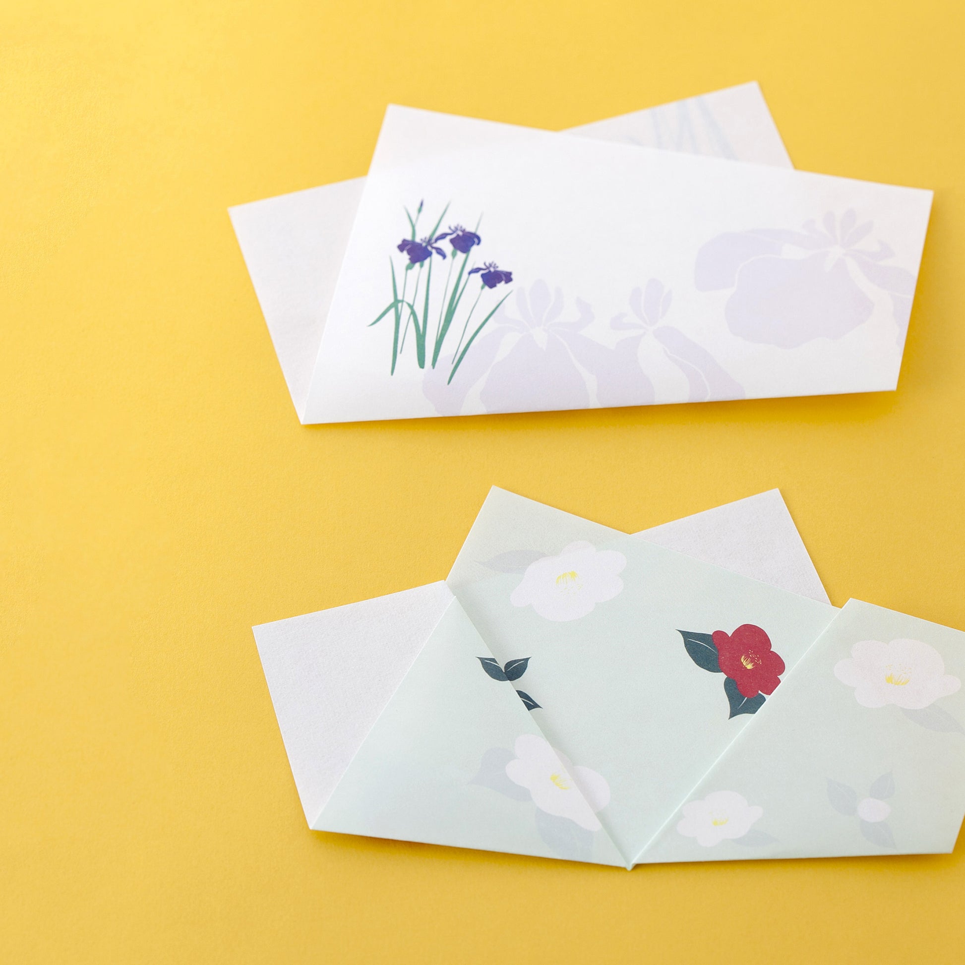 寒い冬の季節に、鮮やかな花を咲かせる椿を描いた懐紙です。雪の中でも凛と咲く椿は、古くからおめでたい花として親しまれてきました。
