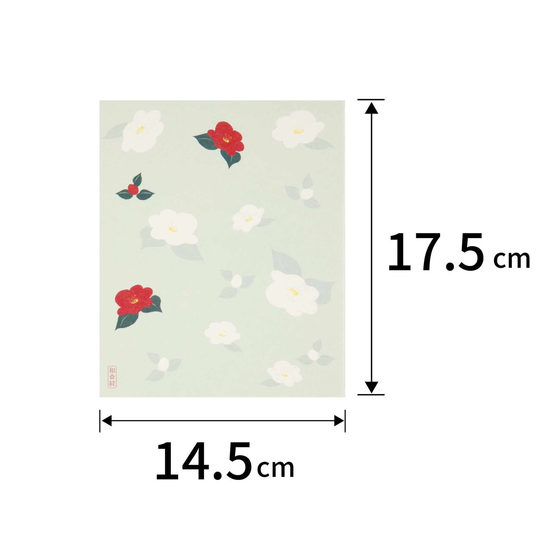 淡い緑色の背景に、赤と白の椿が優雅に舞い散る様子が描かれており、冬の静けさと華やかさを感じさせます。温かいお茶とお菓子をいただく際に、この懐紙を添えるだけで、心温まるひとときを演出できます。年末年始のご挨拶や、おもてなしの席にもおすすめです。