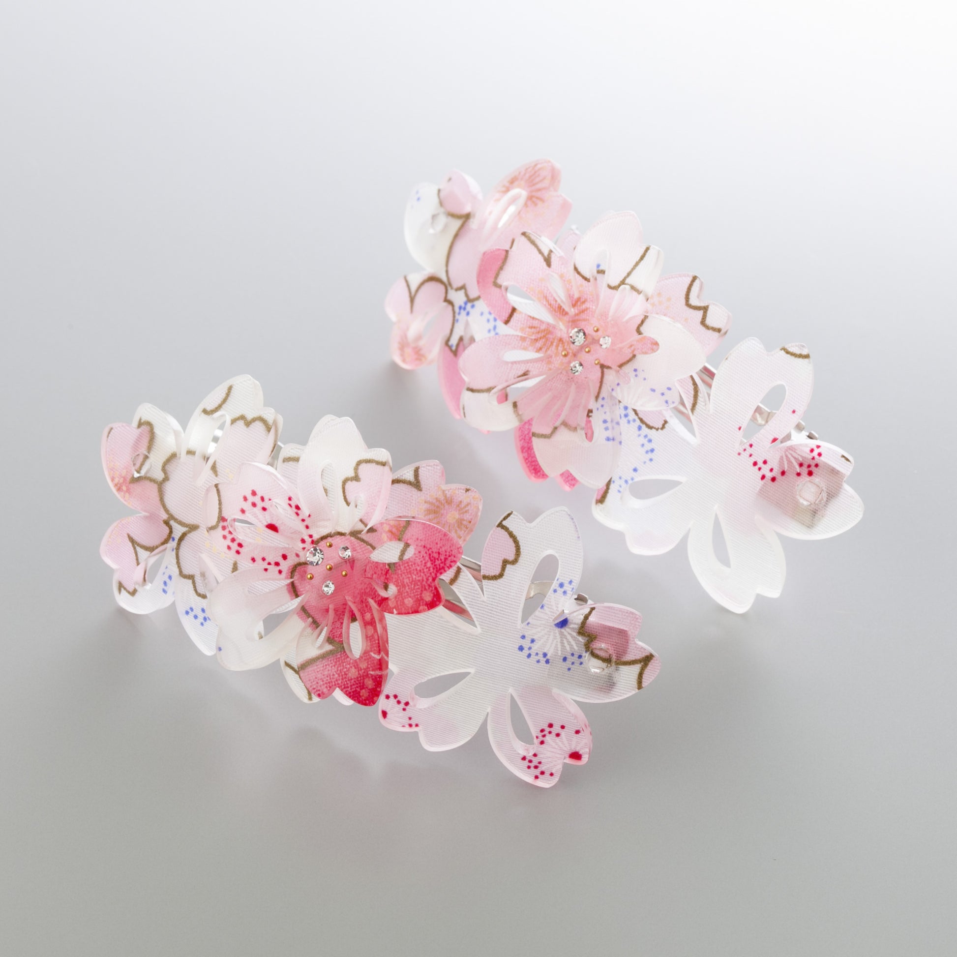 和柄の生地を透明なアクリルに封じ込めた、和の美意識が息づく三連桜のバレッタです。日本の伝統的な花柄の鮮やかな色彩と繊細な美しさを、透明感のあるアクリルの中に。まるで水面に浮かぶ花びらのように、光を受けてキラキラと輝き、日常にさりげない華やかさを添えます。中心にあしらわれたクリスタルが、さらに上品な輝きをプラス。洋装・和装を問わず、装いに彩りを加えるレトロモダンなヘアアクセサリーです。