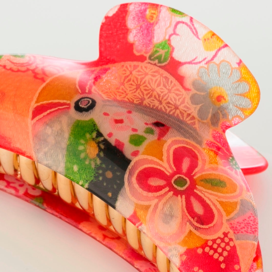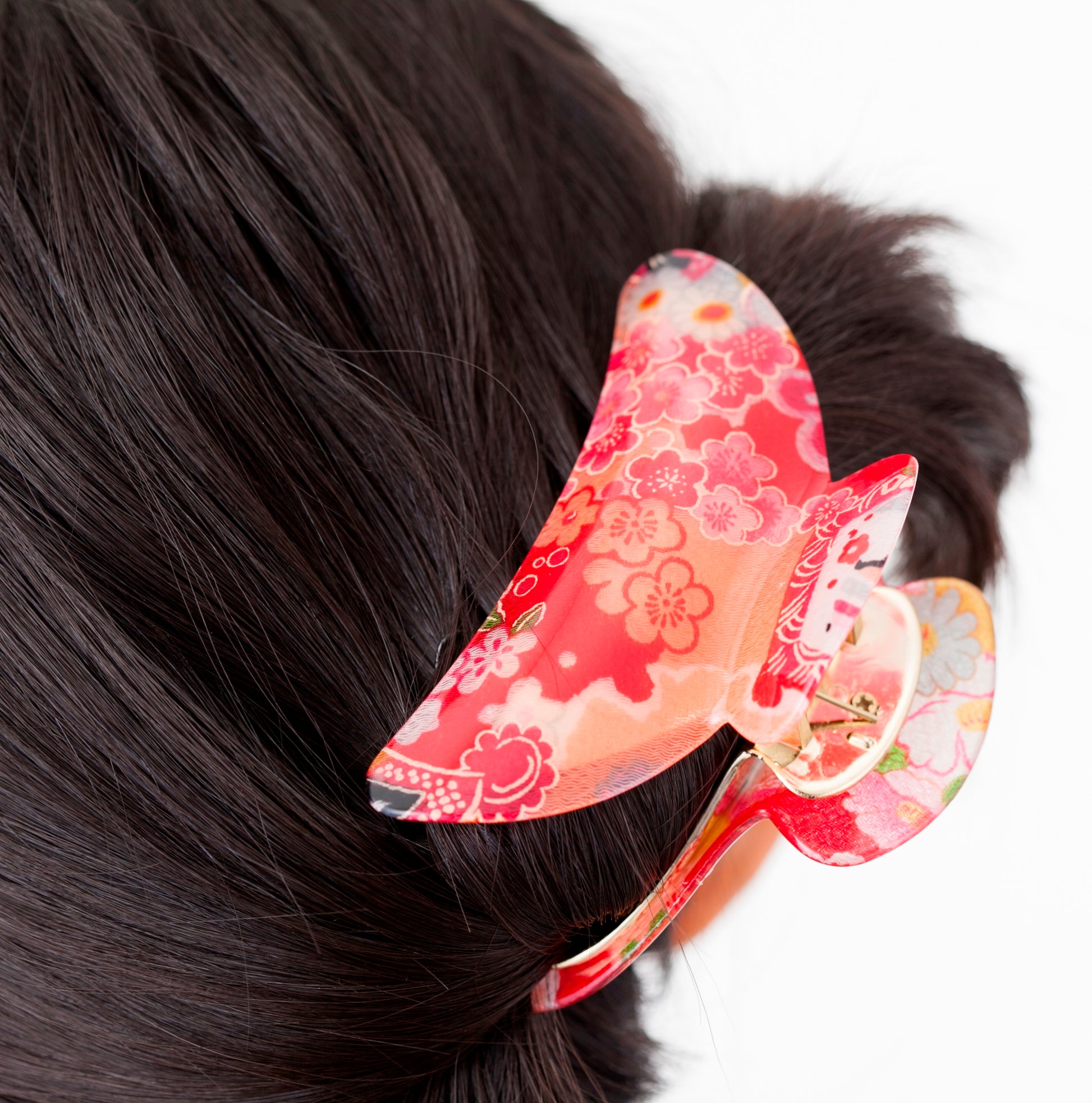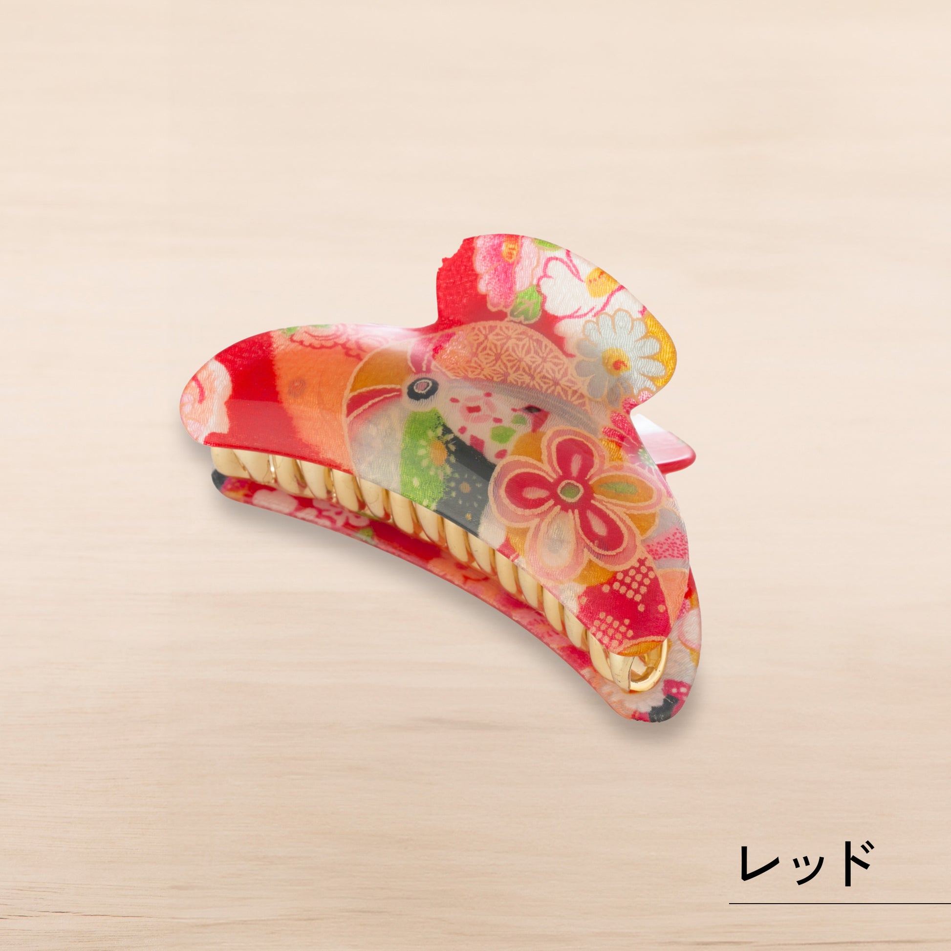 アクリル和布の透明感と艶感が美しいバンズクリップです。大きな口でがっちりと髪を留める事ができ1つ持っておけばさっと髪を纏めたい時に簡単に髪を束ねる事が出来ます。