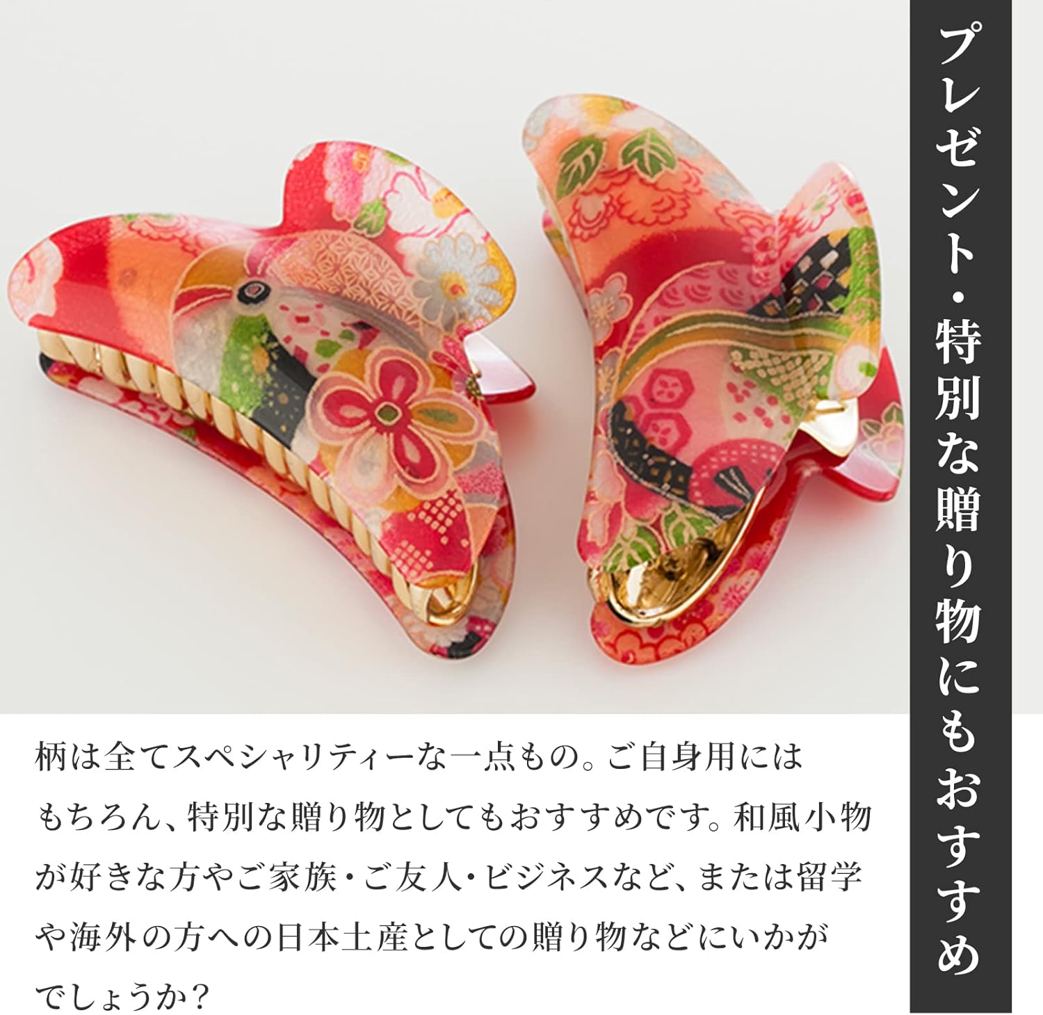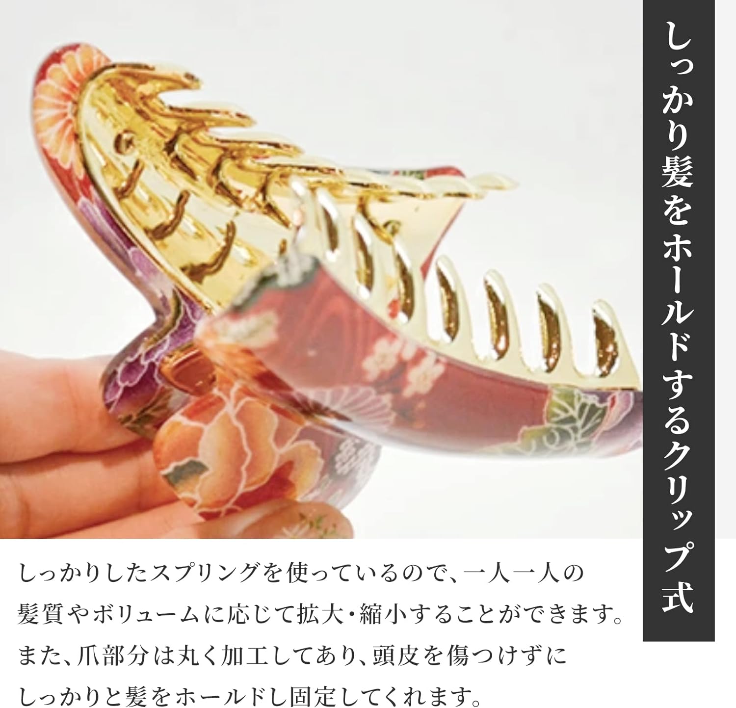 シンプルですが大きめサイズで、華やかで品の良い和柄デザインが目を引きます。 どんな装いにも合わせられるので、髪をさっとまとめたい時の普段使いにはもちろん、パーティーなどのヘアアレンジにもお使いいただけます。