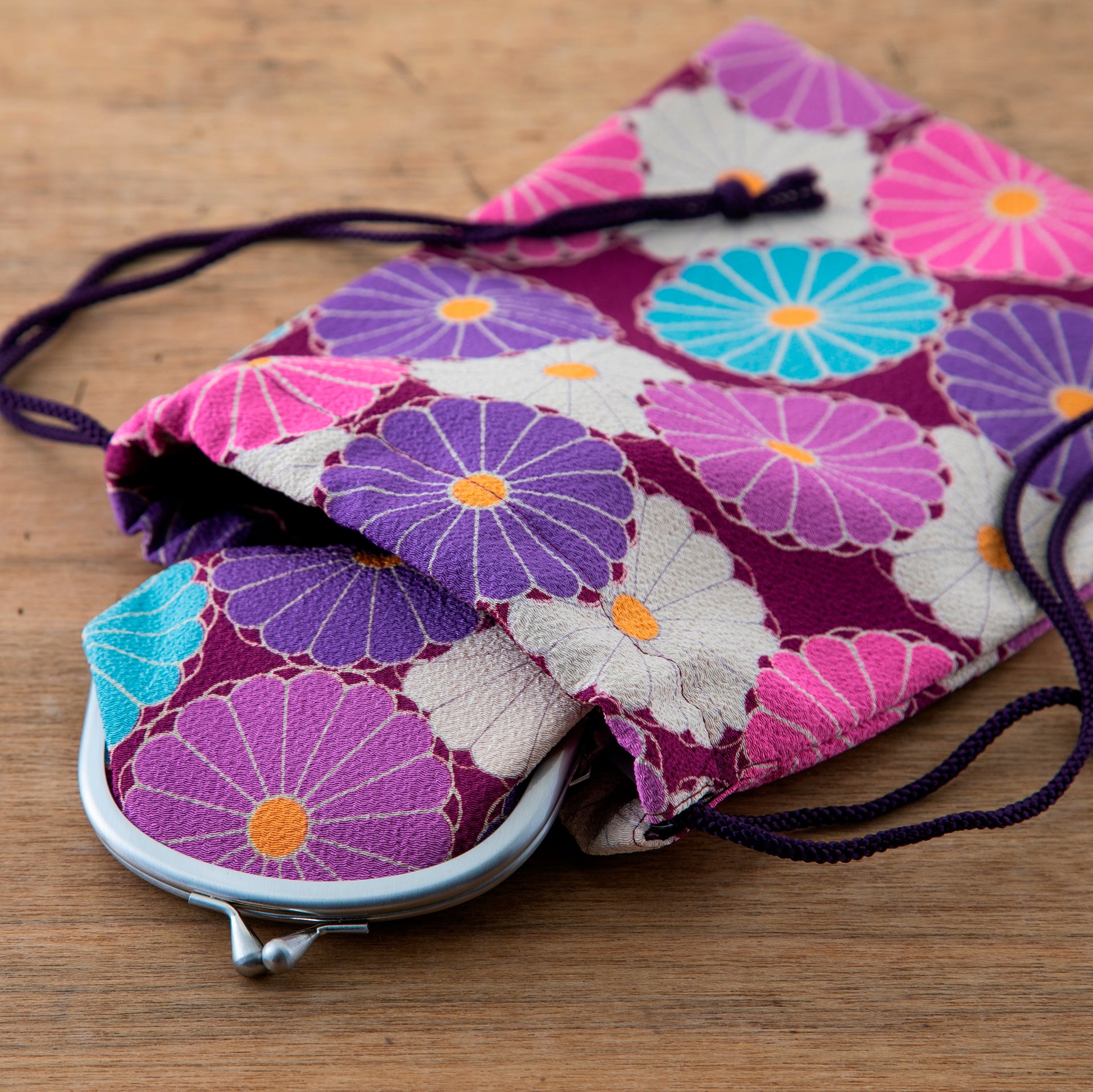 のレン オリジナルのファブリック、レトロフラワーを用いた巾着は、柔らかなちりめん織の風合いが魅力。生地表面の繊細な凹凸が光をやわらかく反射し、色彩に深みを与えて上品な趣を演出します。和の彩りをモダンに映し出す柄と相まって、どこか懐かしくも新鮮な「レトロモダン」の世界観を表現したデザインで、シワになりにくく、普段使いにはもちろん、ちょっとしたお出かけにも華やぎを添えてくれる逸品です。