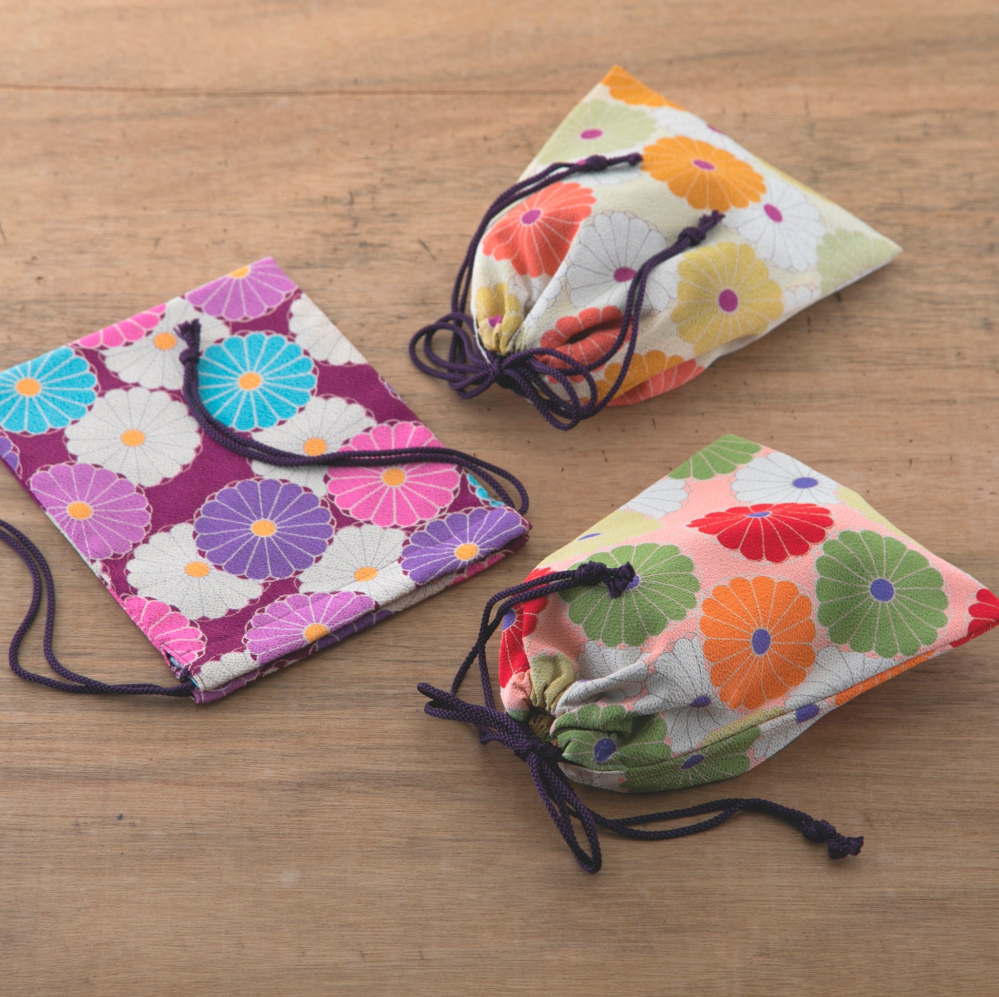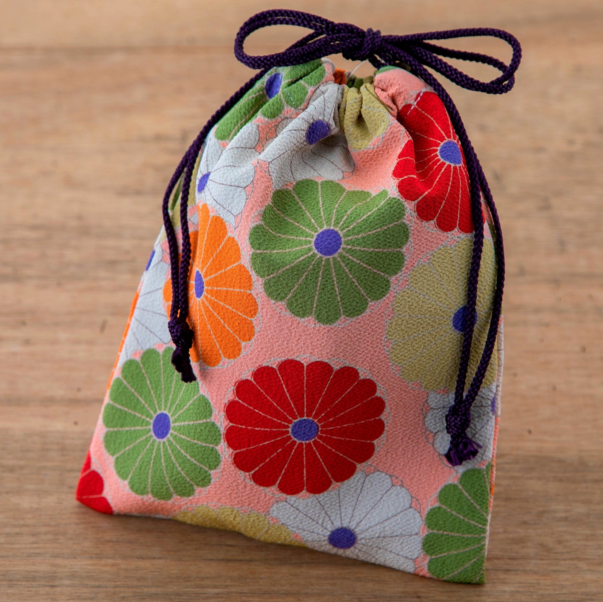のレン オリジナルのファブリック「菊華」を使用した巾着袋です。ちょっとしたお出かけにはもちろん、バッグインバッグや小物整理にも活躍。ペットボトルホルダーや御朱印帳袋、化粧ポーチやモバイル機器入れなど、アイデア次第で使い道が広がる万能アイテムです。