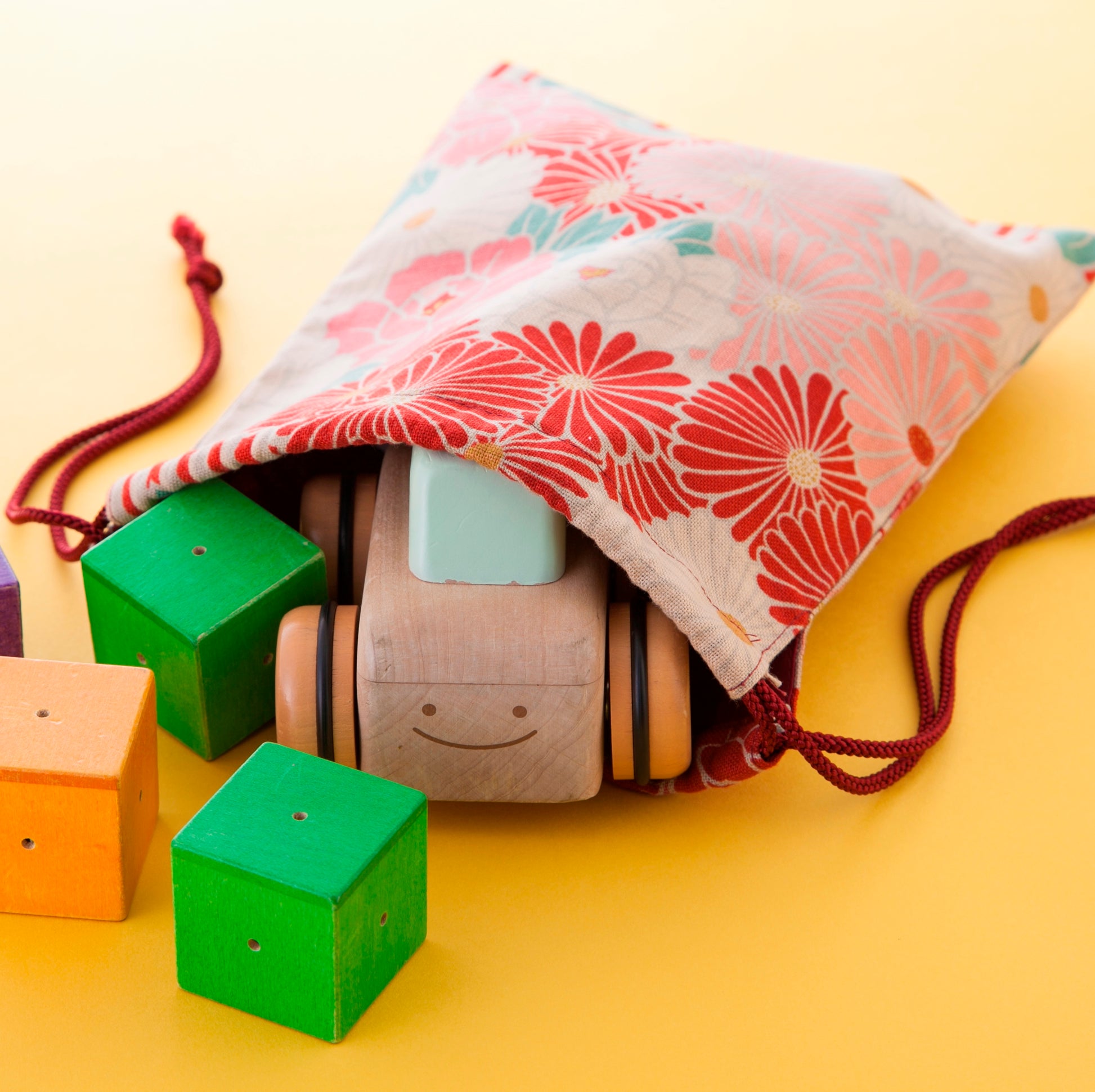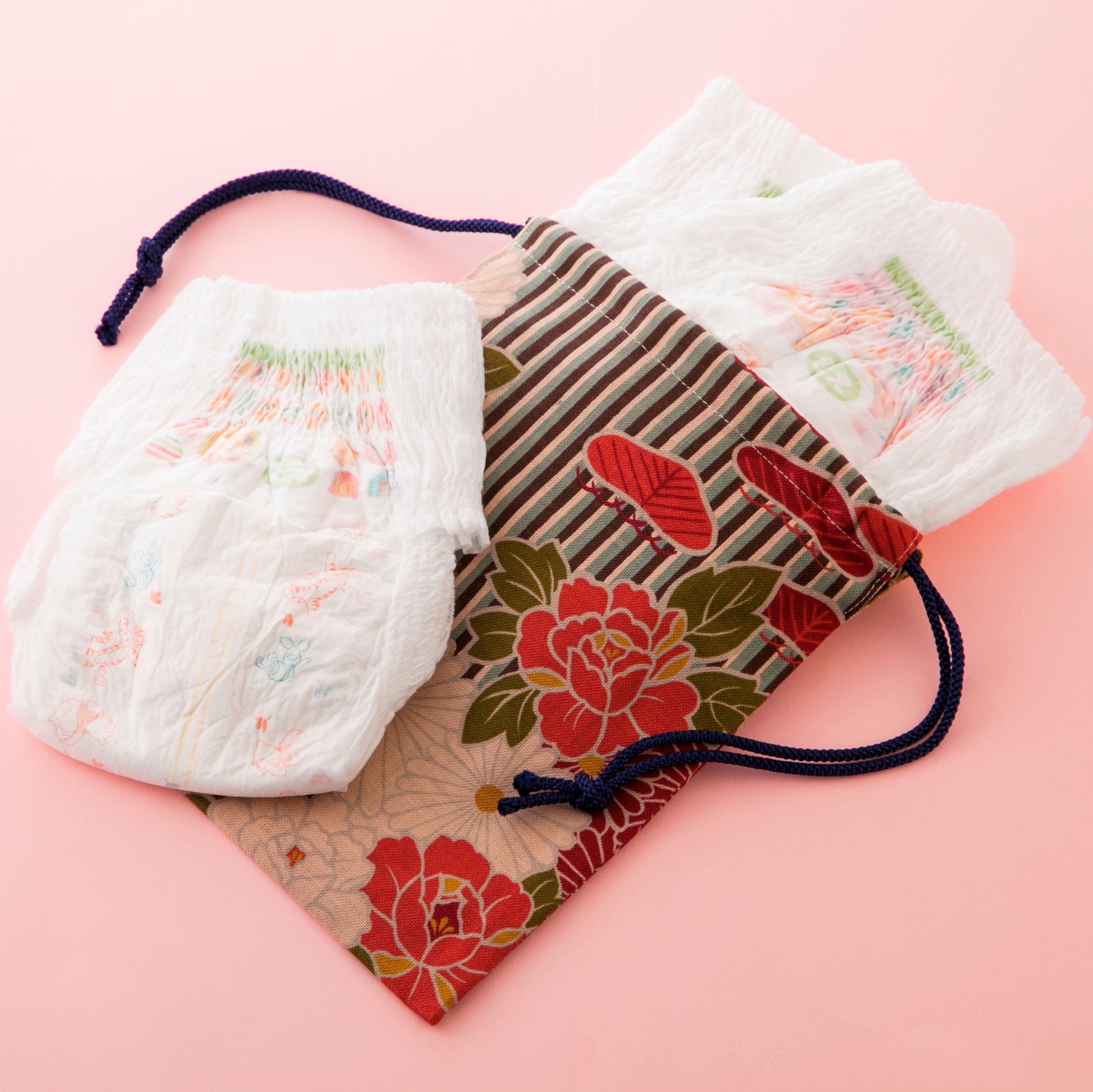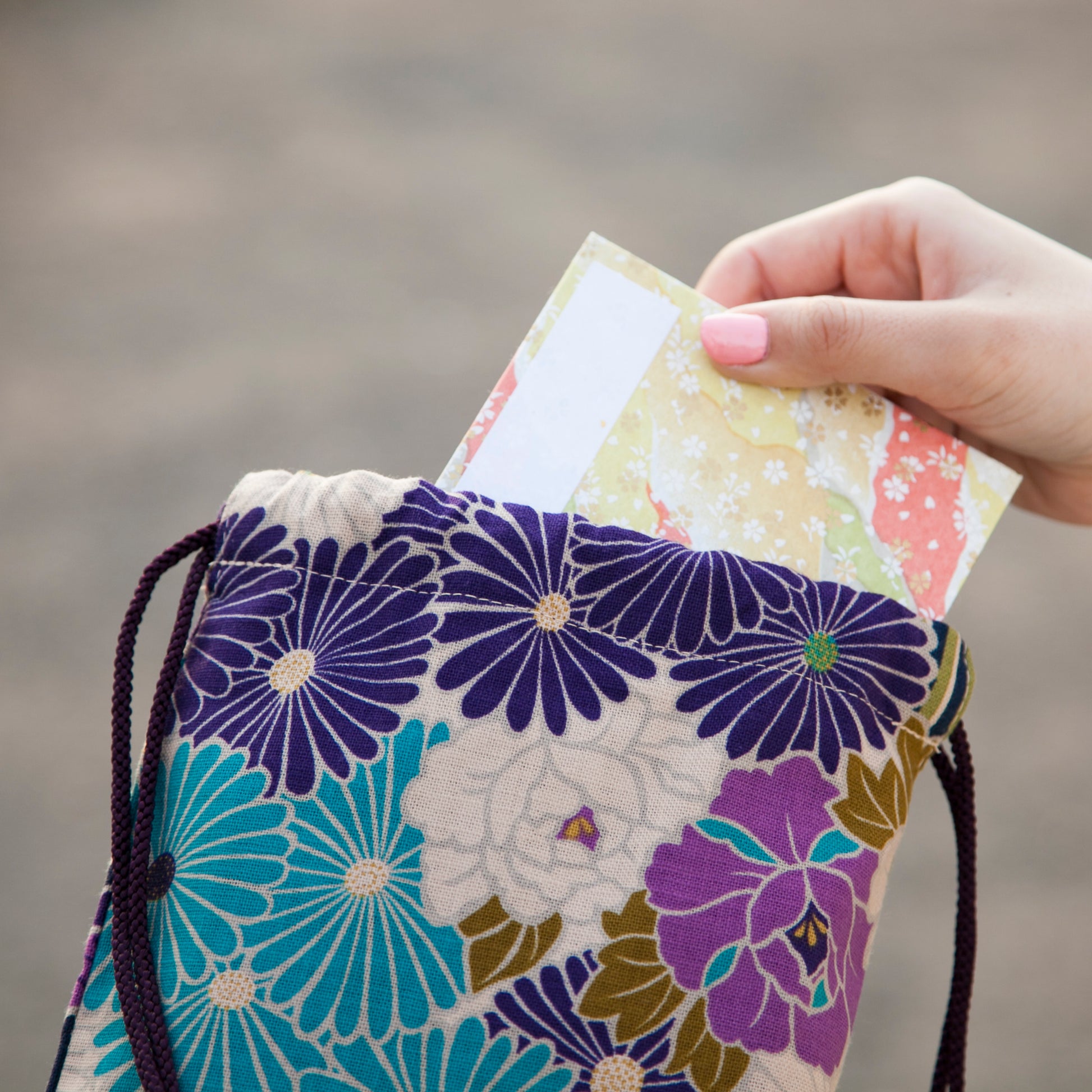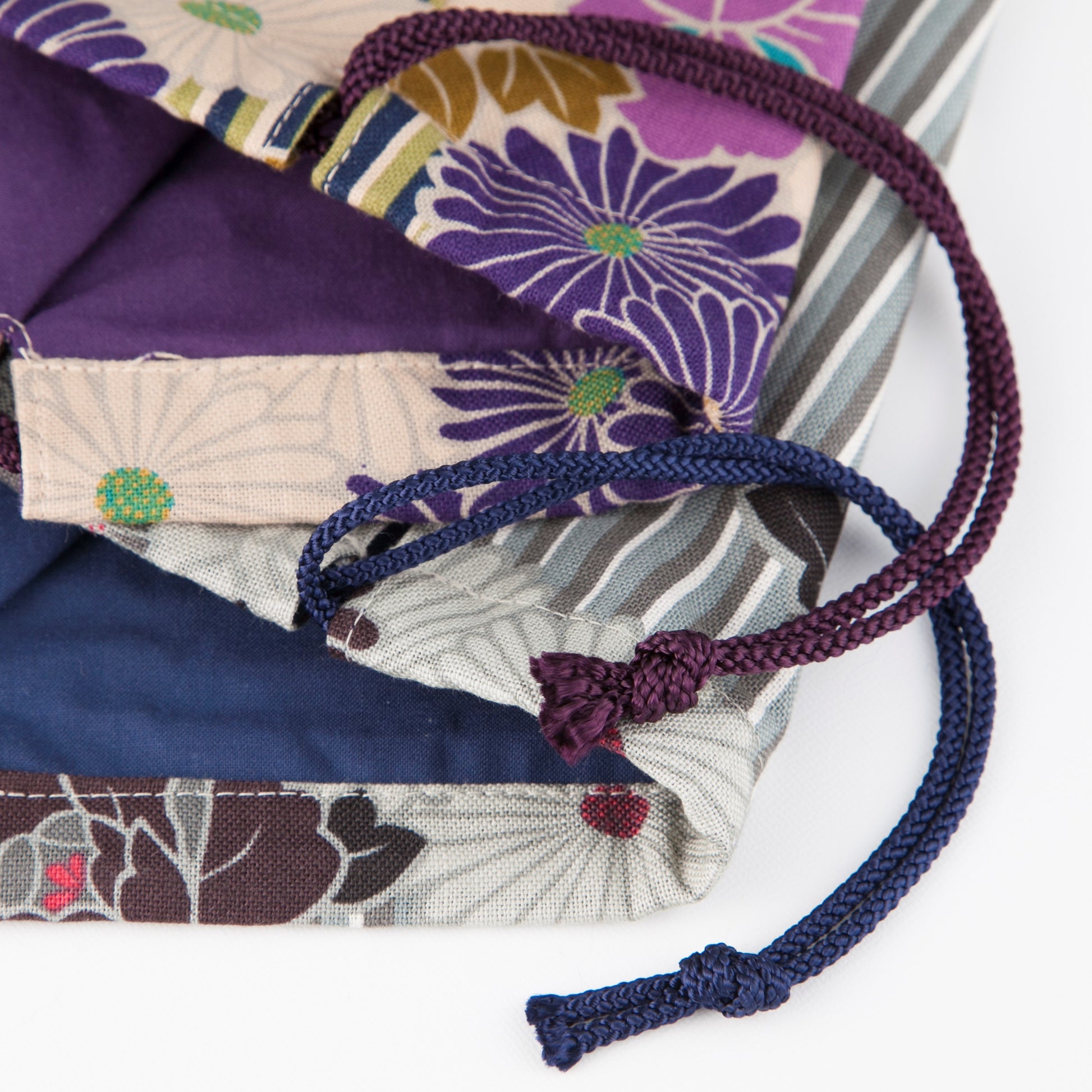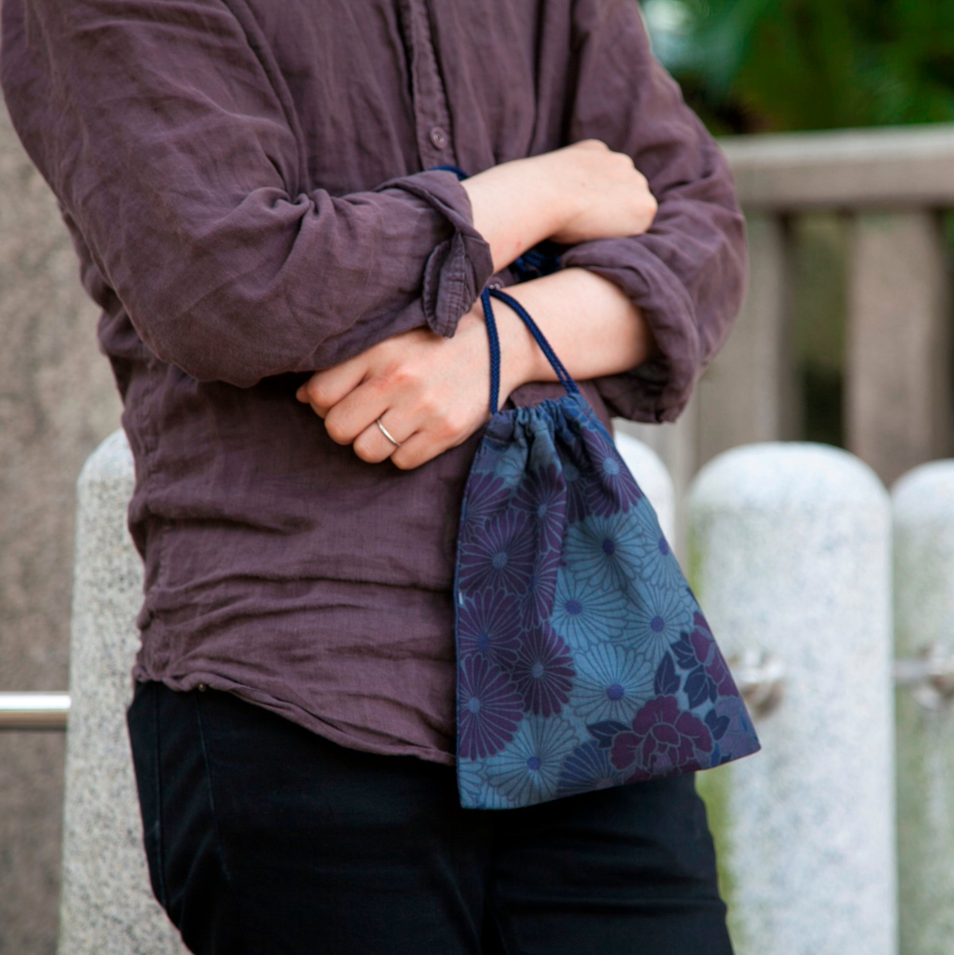縫製はすべて日本国内で行い、内側には柄に合わせた裏地をあしらいました。摩擦や引っ張りにも強い仕立てで、毎日安心してお使いいただけます。巾着の紐は少し長めにとり、しっかり結びやすく・解けにくい、細部にまでこだわったデザインです。