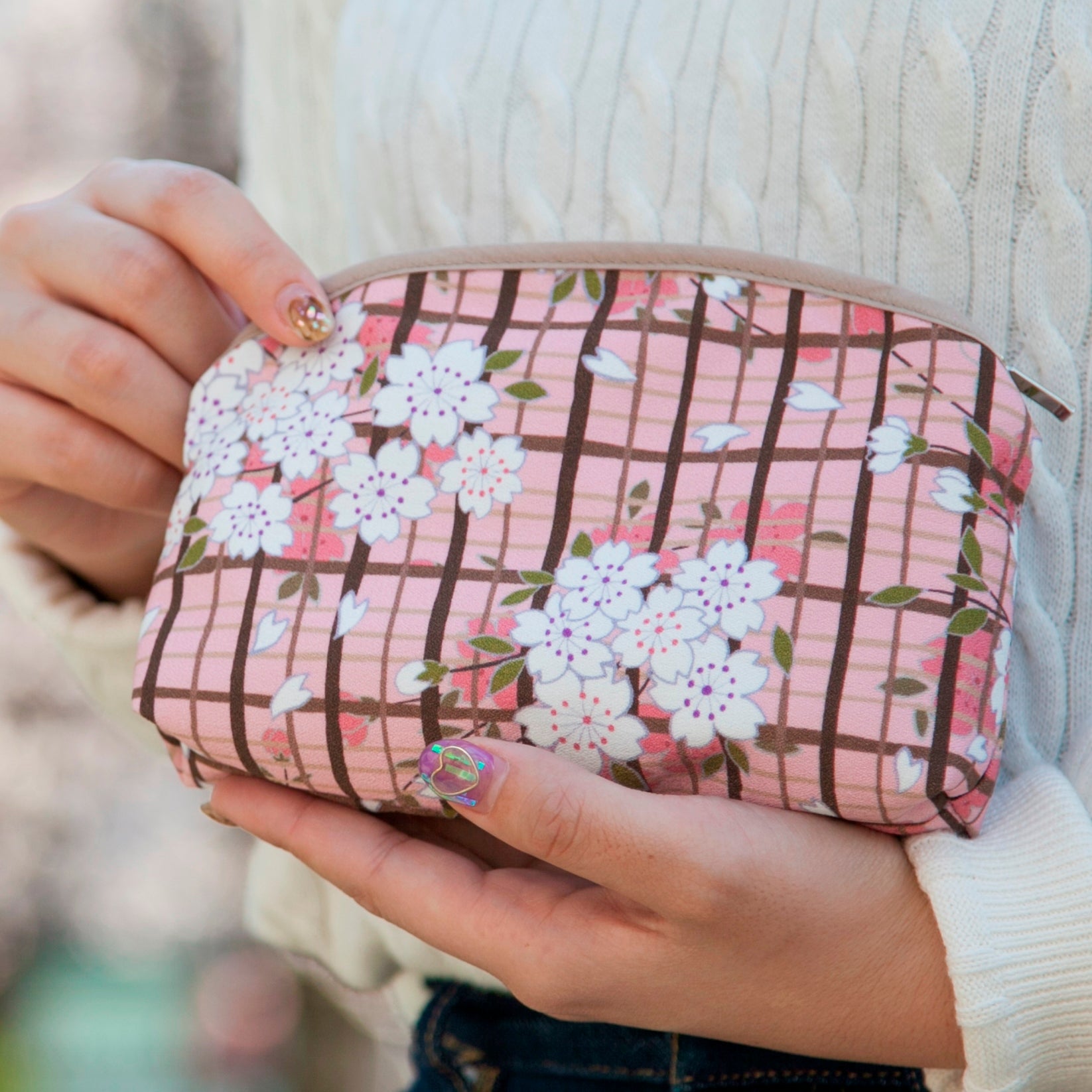 のレンオリジナルのファブリック、桜格子を使用した化粧ポーチは、日々の暮らしにそっと和の彩りを添える逸品です。優雅に咲く桜の花と、格子模様が織りなす調和が、和の美しさを際立たせ、どこか懐かしくも新しい「レトロモダン」な世界観を表現します。落ち着いた色合いと、格子模様のシンプルさが、より一層引き立てる桜の花々が、日常を華やかに彩ります。普段使いはもちろん、お出かけにもぴったりなエレガントなアクセントをプラスします。