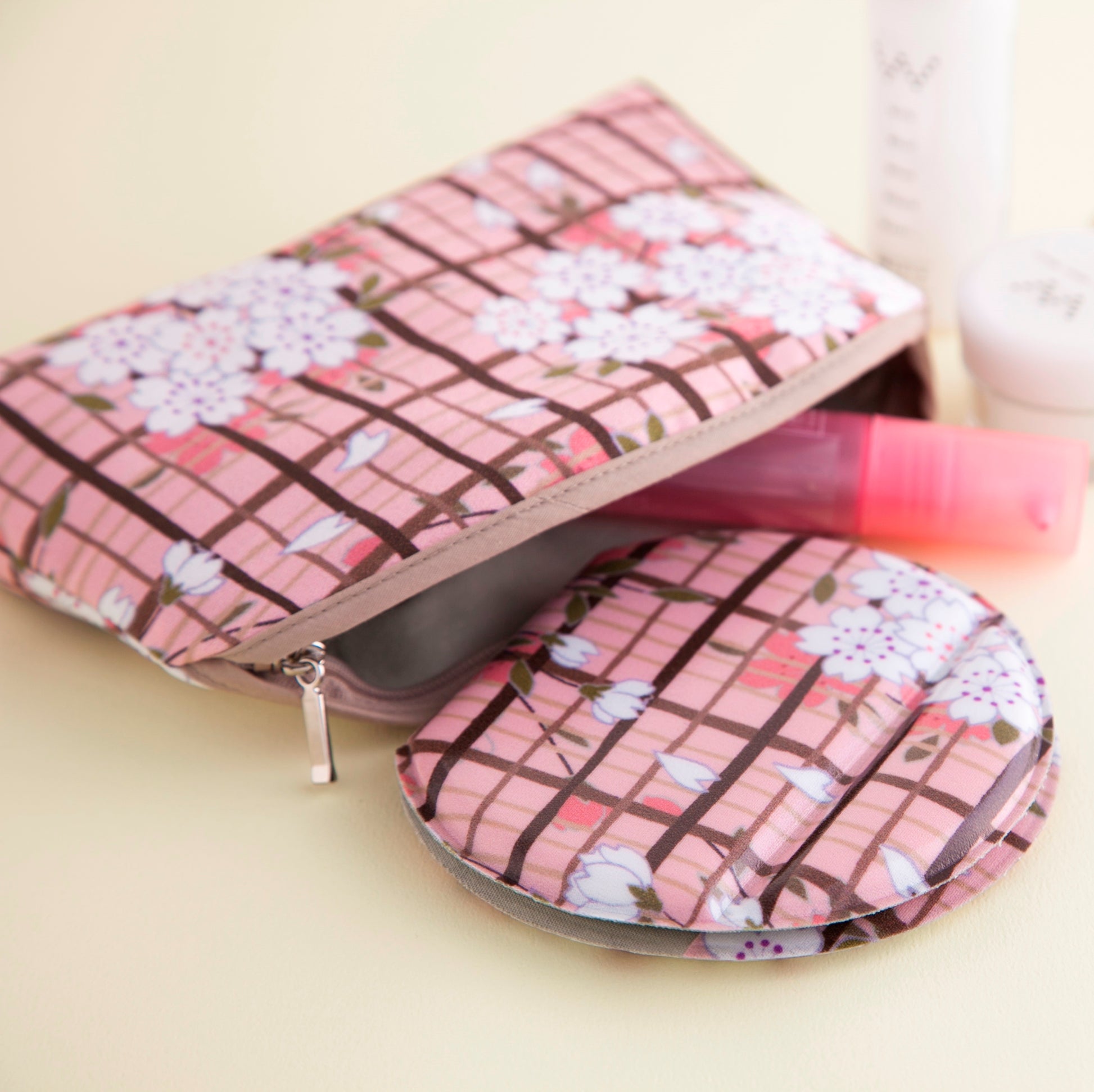 のレンオリジナル「桜格子」柄の化粧ポーチは、日本の美意識を詰め込んだ、レトロで気品あふれるデザインが魅力です。伝統的な桜の花をモチーフに、格子模様と相まって優雅で落ち着いた雰囲気を醸し出します。バッグに入れてもかさばらないスリムな形状ながら、見た目以上の収納力を誇り、ファスナーにはそれぞれの生地にぴったりの上品な色を選んでおり、統一感のある仕上がりです。