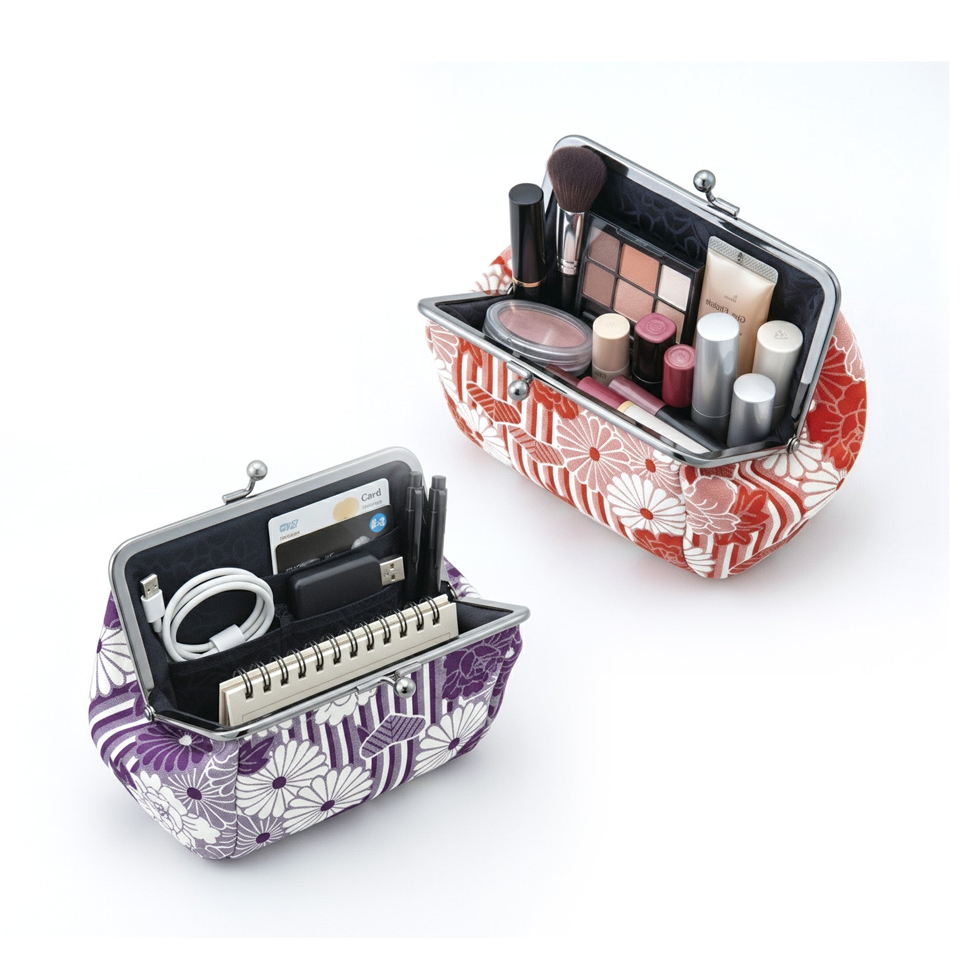 口金で大きく開く大口タイプなので、ポーチの中が一目で見渡しやすいのが最大の特徴です。化粧品やメイクブラシなどのコスメはもちろん、モバイルバッテリー、充電ケーブル、文房具、お薬といったバッグの中でかさばりがちな小物類の整理に最適。必要なアイテムをさっと取り出せ、毎日のお出かけが快適になります。