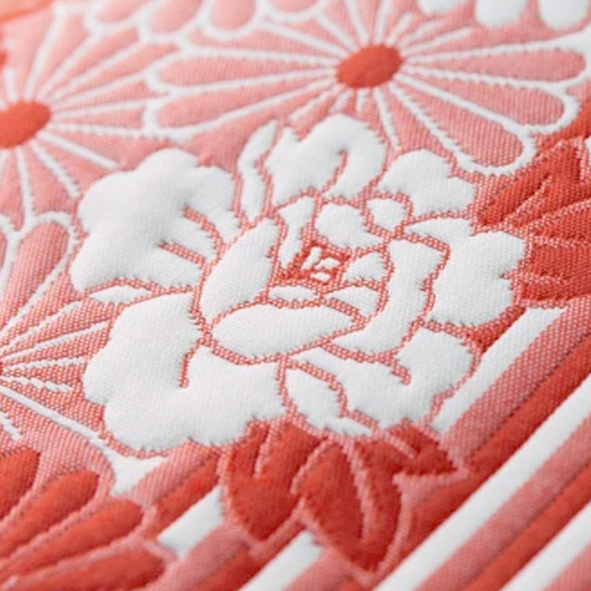 ふくれ織は、二重に織り込むことで紋様がふくれたように立体的に浮き上がる、着物にも使われる伝統的な織物技術です。この技法によって、ポーチの表面に繊細な凹凸と豊かな表情が生まれ、上品な高級感と手触りの良さを兼ね備えています。菊や牡丹の花をあしらったレトロモダンな柄には、菊が不老長寿や健康、牡丹が幸福・高貴・豪華といった深い意味合いが込められており、美しさだけでなくお守り的な魅力も持っています。