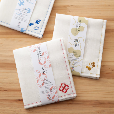 お配りものやご挨拶として贈る機会の多いふきん、大切な方に贈るものだからこだわりたい、そんな想いから開発を何度も重ねました。刺繍には日本に古くから伝わる縁起の良い吉祥文様が施され、贈り物に意味をのせて贈ることができます。ぜひ贈り物にいかがでしょうか。