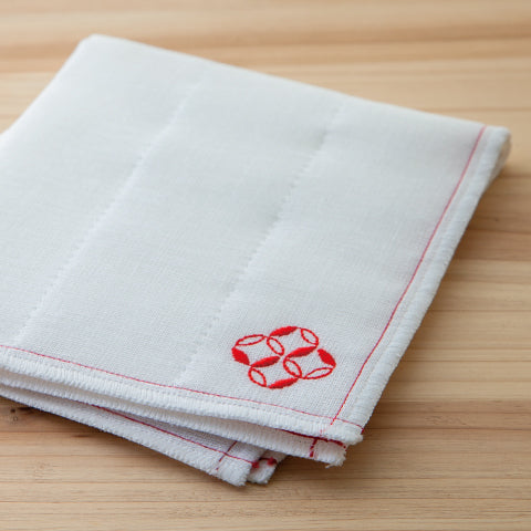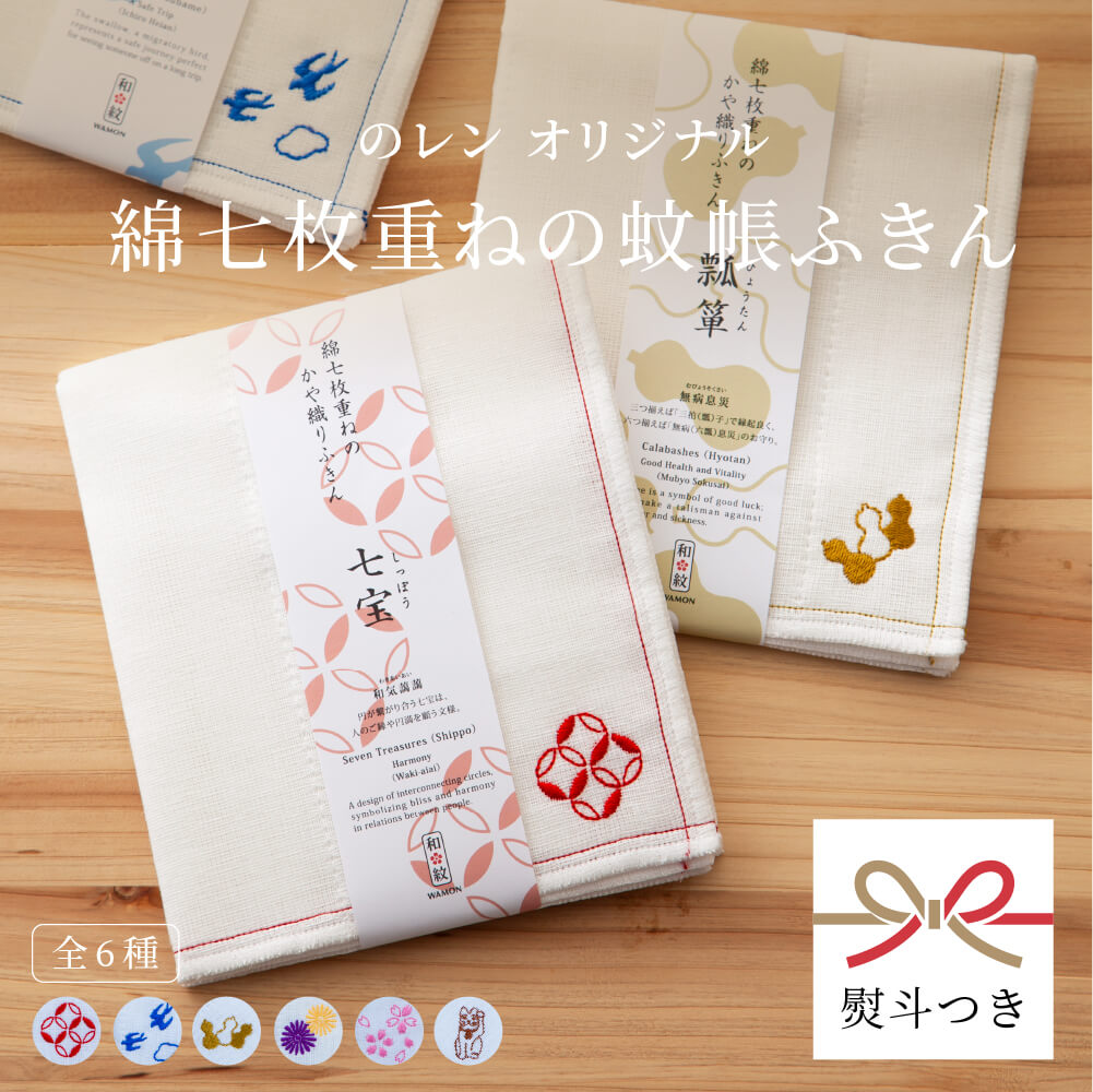 のレンのオリジナル刺繍を施した綿100%の蚊帳ふきんです。通常のレーヨン素材や綿五枚重ねと比べ、強度が高く、柔らかで吸水性に優れた綿七枚重ねを採用しています。縁起の良い吉祥文様の刺繍が施され、贈り物としても最適です。