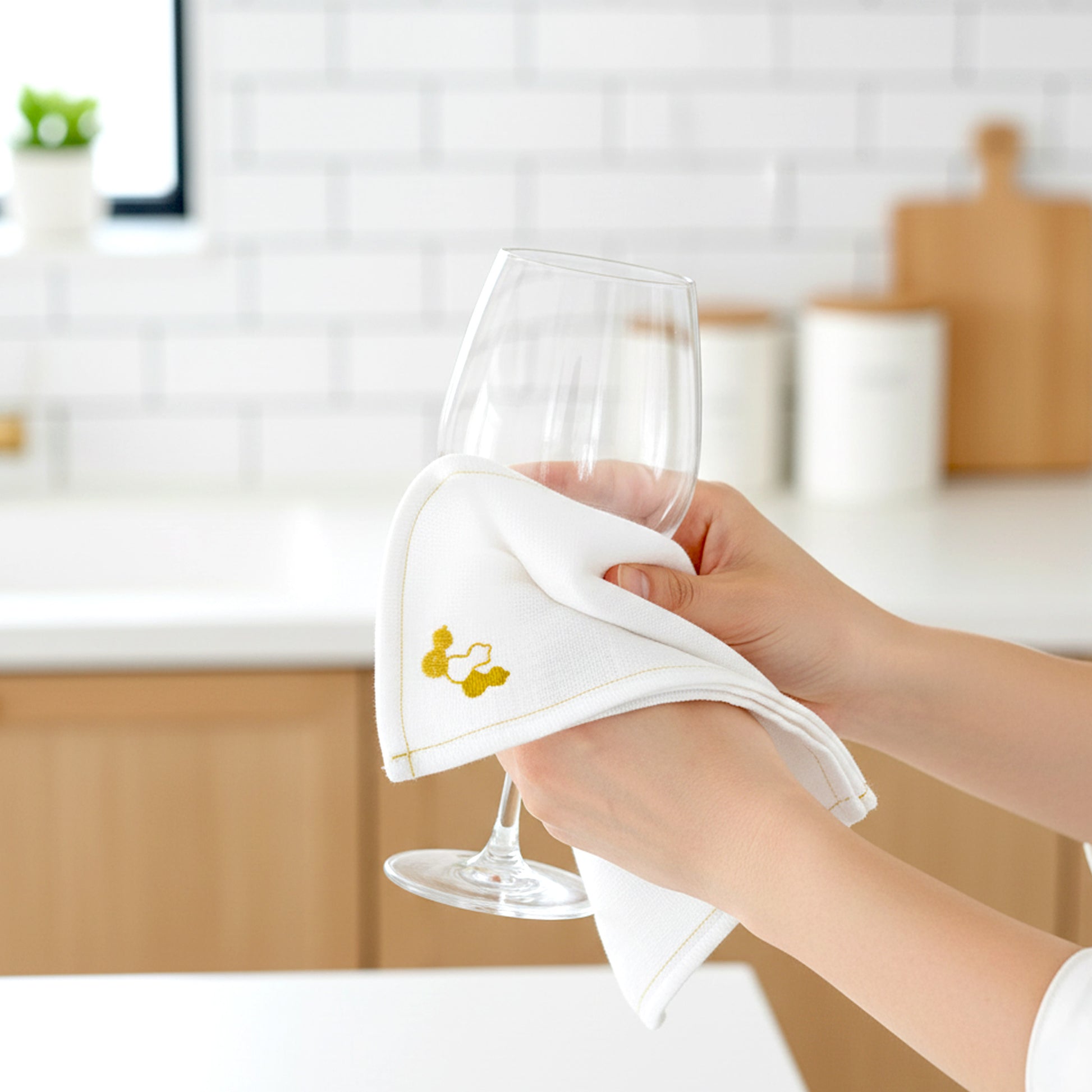 グラスやお皿の水滴をすっと吸い取り、使うほどに柔らかさが増して手になじむ生地が、拭き跡を残さず清潔に仕上げてくれるので、日々の食卓シーンを心地よく支えてくれます。
