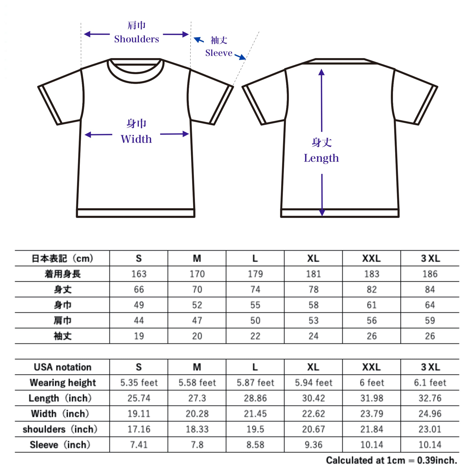 サイズ:S 身長:163cm 身丈:66cm 身巾:49cm 肩巾:44cm 袖丈:19cm/M 身長:170cm 身丈:70cm 身巾:52cm 肩巾:47cm 袖丈:20cm/L 身長:179cm 身丈:74cm 身巾:55cm 肩巾:50cm 袖丈:22cm/XL 身長:181cm 身丈:78cm 身巾:58cm 肩巾:53cm 袖丈:24cm/XXL 身長:183cm 身丈:82cm 身巾:61cm 肩巾:56cm 袖丈:26cm/3XL 身長:186cm 身丈:84cm 身巾:64cm 肩巾:59cm 袖丈:26cm