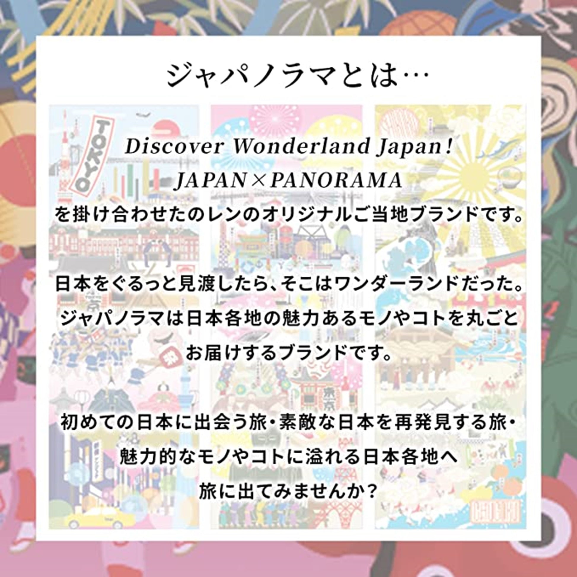 JAPAN×PANORAMAを掛け合わせた のレンオリジナルご当地ブランドです。 日本をぐるっと見渡したら、そこはワンダーランドだった。ジャパノラマは日本各地の魅力あるモノやコトを丸ごとお届けするブランドです。 初めての日本に出会う旅、素敵な日本を再発見する旅・魅力的なモノやコトに溢れる日本各地へ旅に出てみませんか?