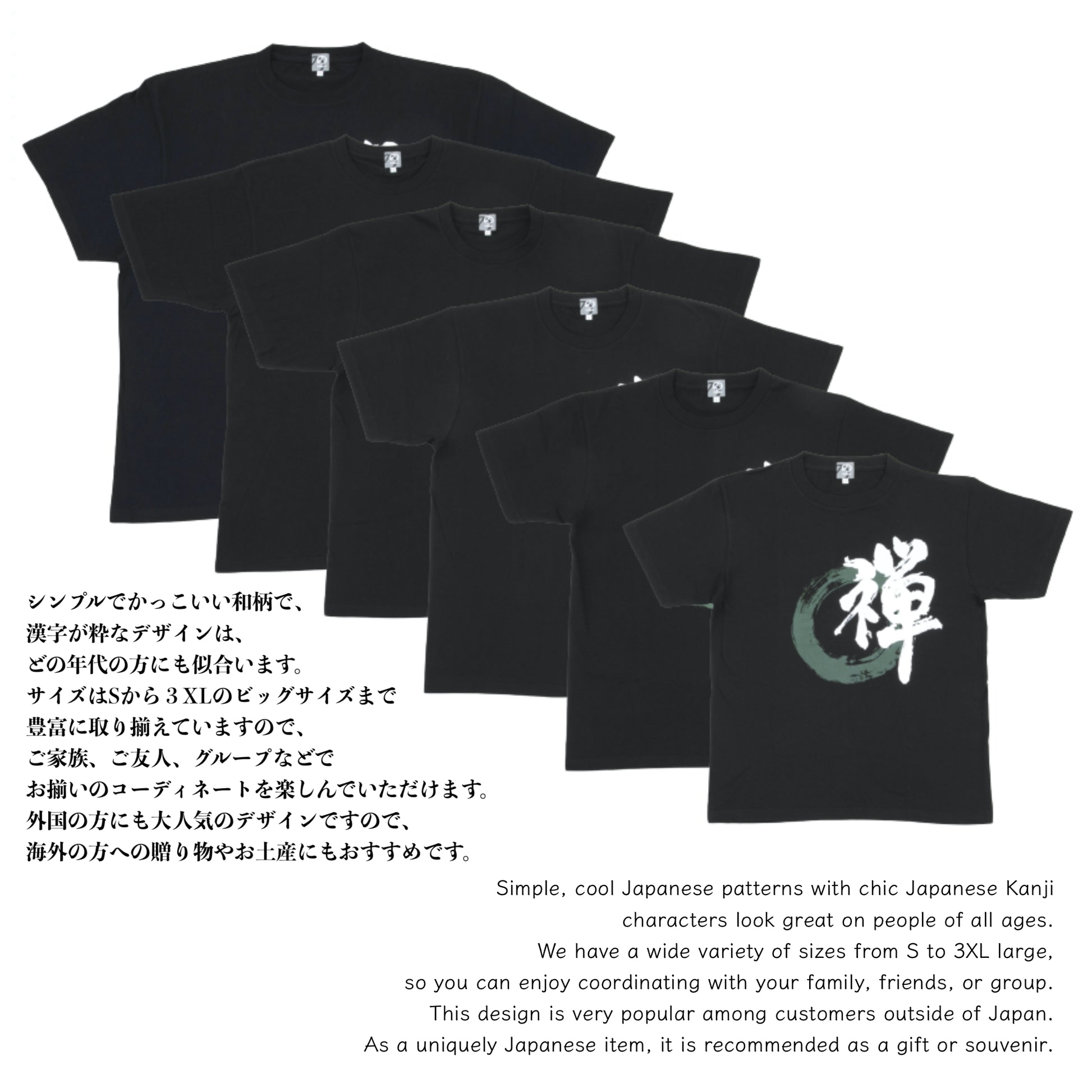 シンプル・かわいい和柄で、漢字が粋なデザインは、どの年代の方にも似合います。サイズはSサイズから3XLサイズまで豊富に取り揃えていますので、ご家族でお揃いのコーディネートを楽しんでいただけます。
