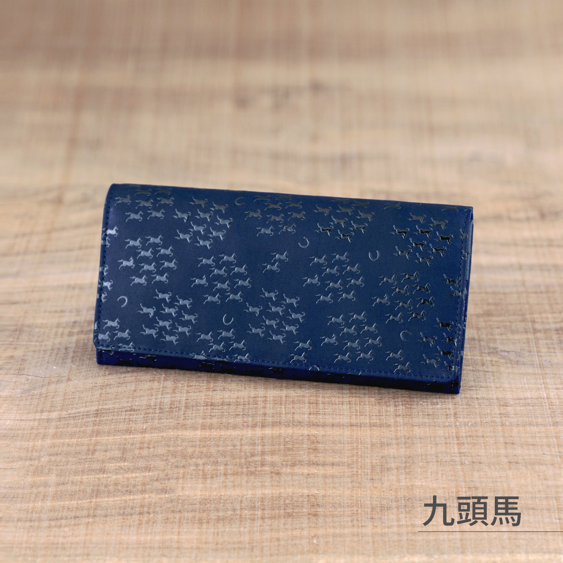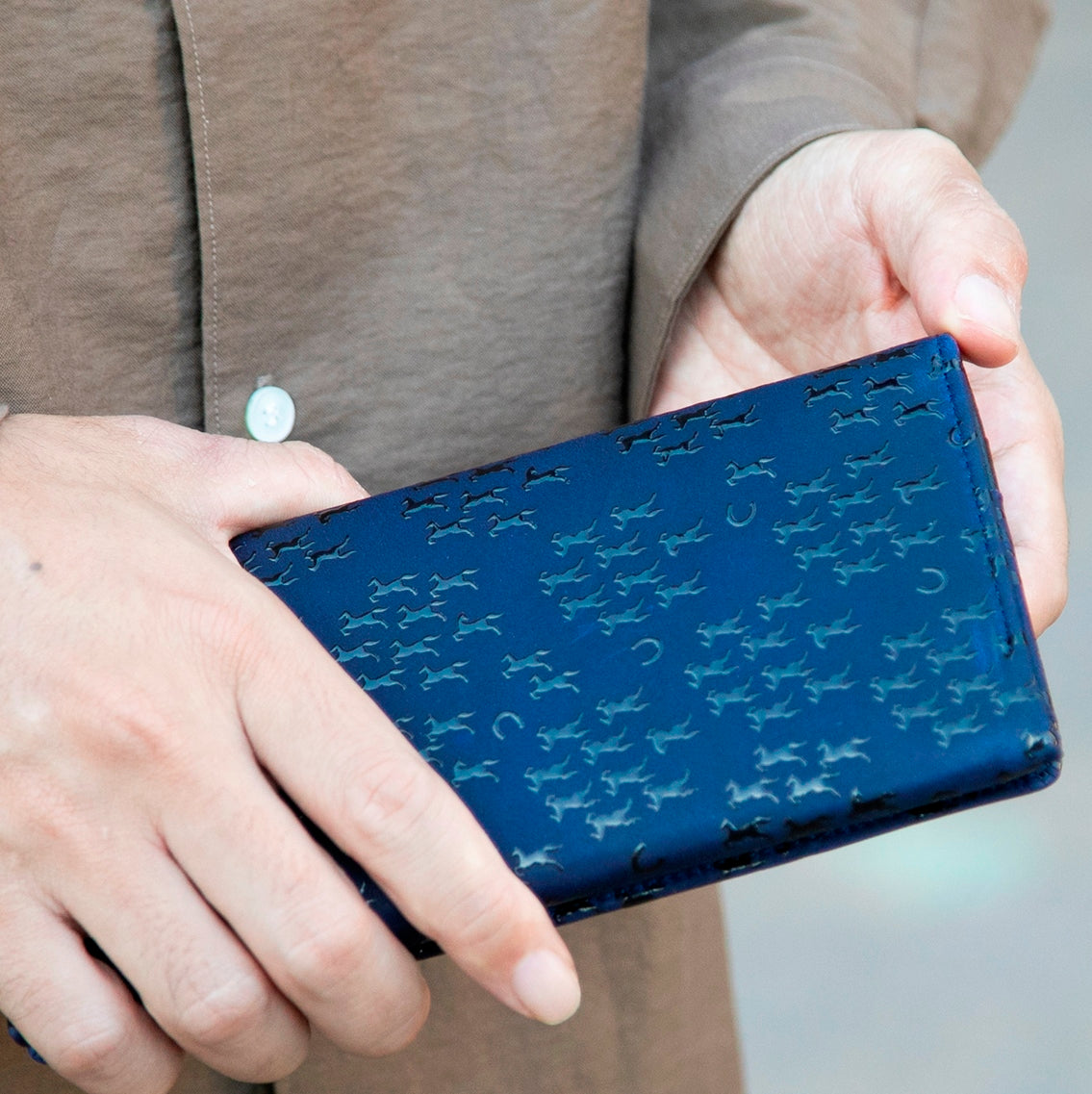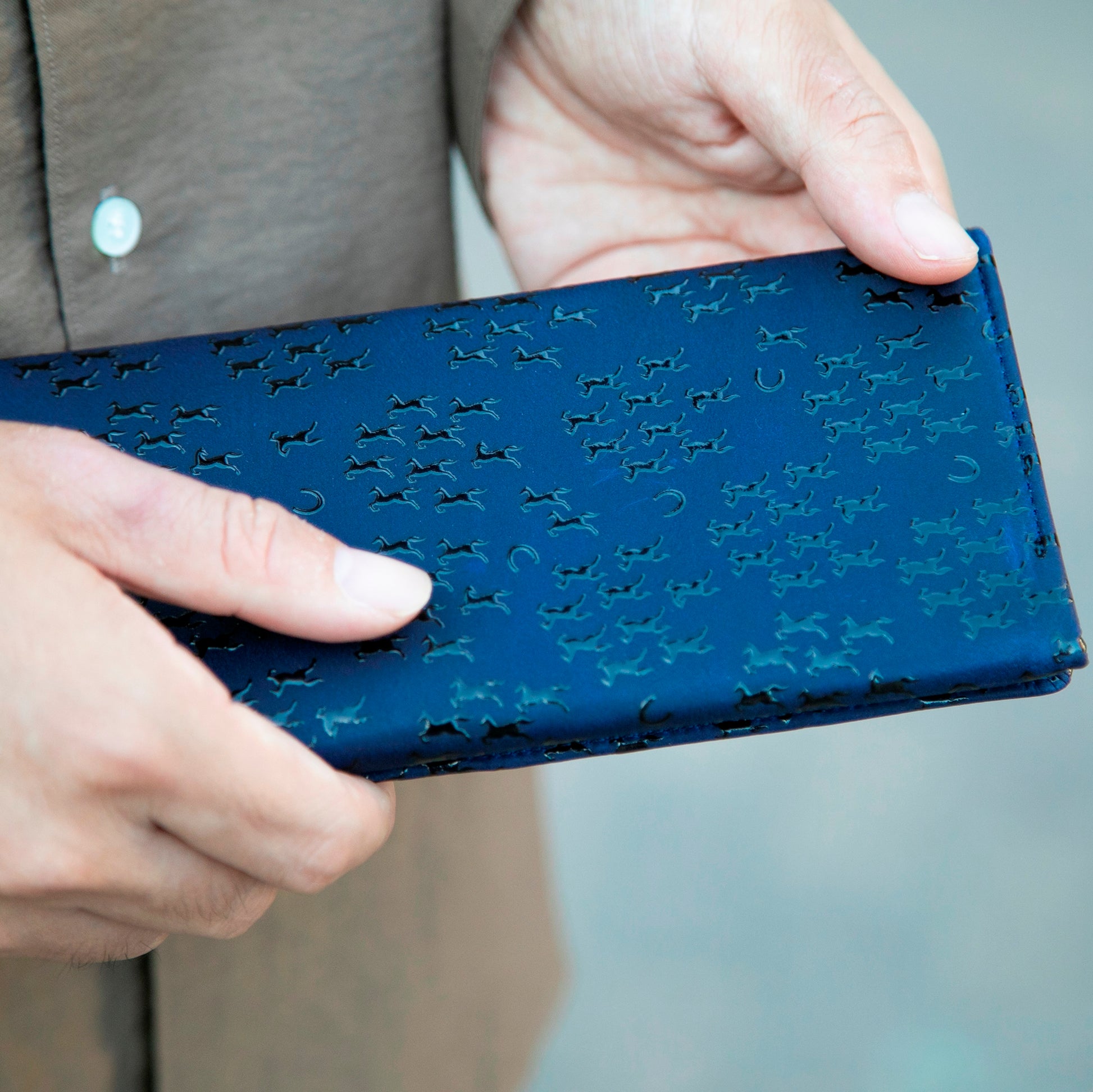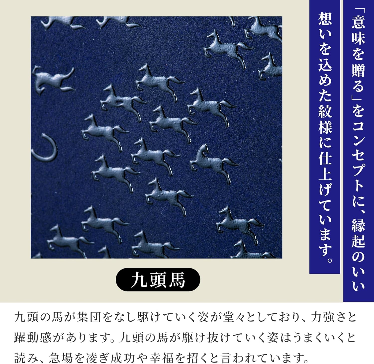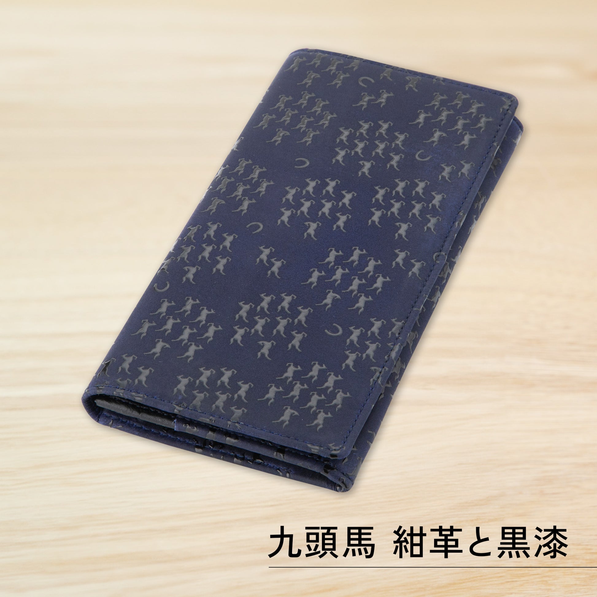 濃い藍色の革に、無数の九頭馬が疾走する様を表現した柄。漆で描かれた馬の模様は、見る角度によって鈍い光を放ち、まるで夜空を駆ける群れのよう。クールな印象のカラーリングながら、馬たちの生き生きとしたシルエットが、持つ人の心を軽やかに、前向きな気持ちにさせてくれます。