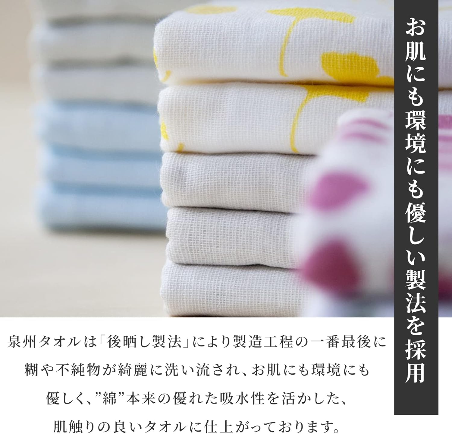 後晒加工の泉州タオルは吸水性が良く、綿本来の 柔らかさを引き出した心地よい触り心地が特徴です。