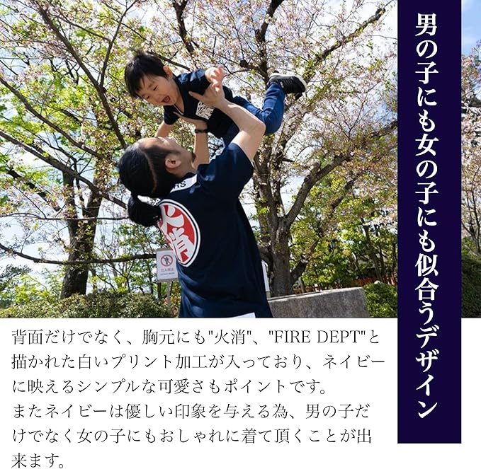 背面だけでなく、胸元にも”火消”、FIRE DEPTと描かれた白いプリント加工が入っており、ネイビーに映えるシンプルな可愛さもポイントです。