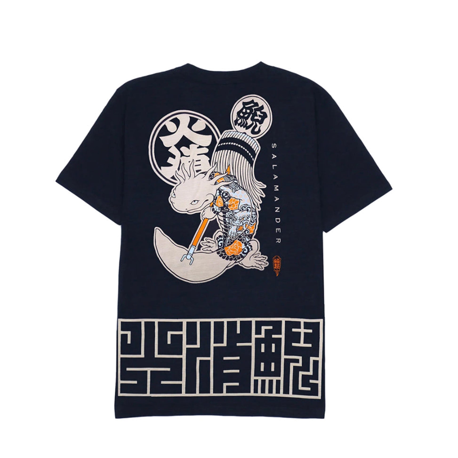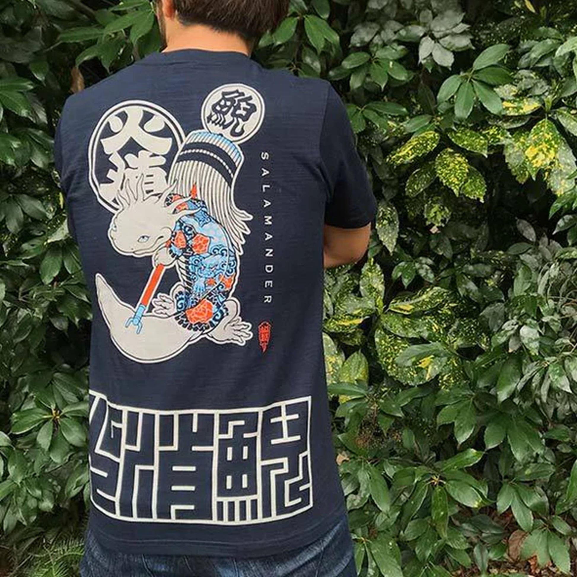 今回のコラボレーションのために書き下ろされた「鯢百態 火消之図」を元に作られたTシャツ。火消に扮して「鯢組」の纏を持ち、縁起と男気の象徴、唐獅子牡丹を背負った粋なサラマンダー。
