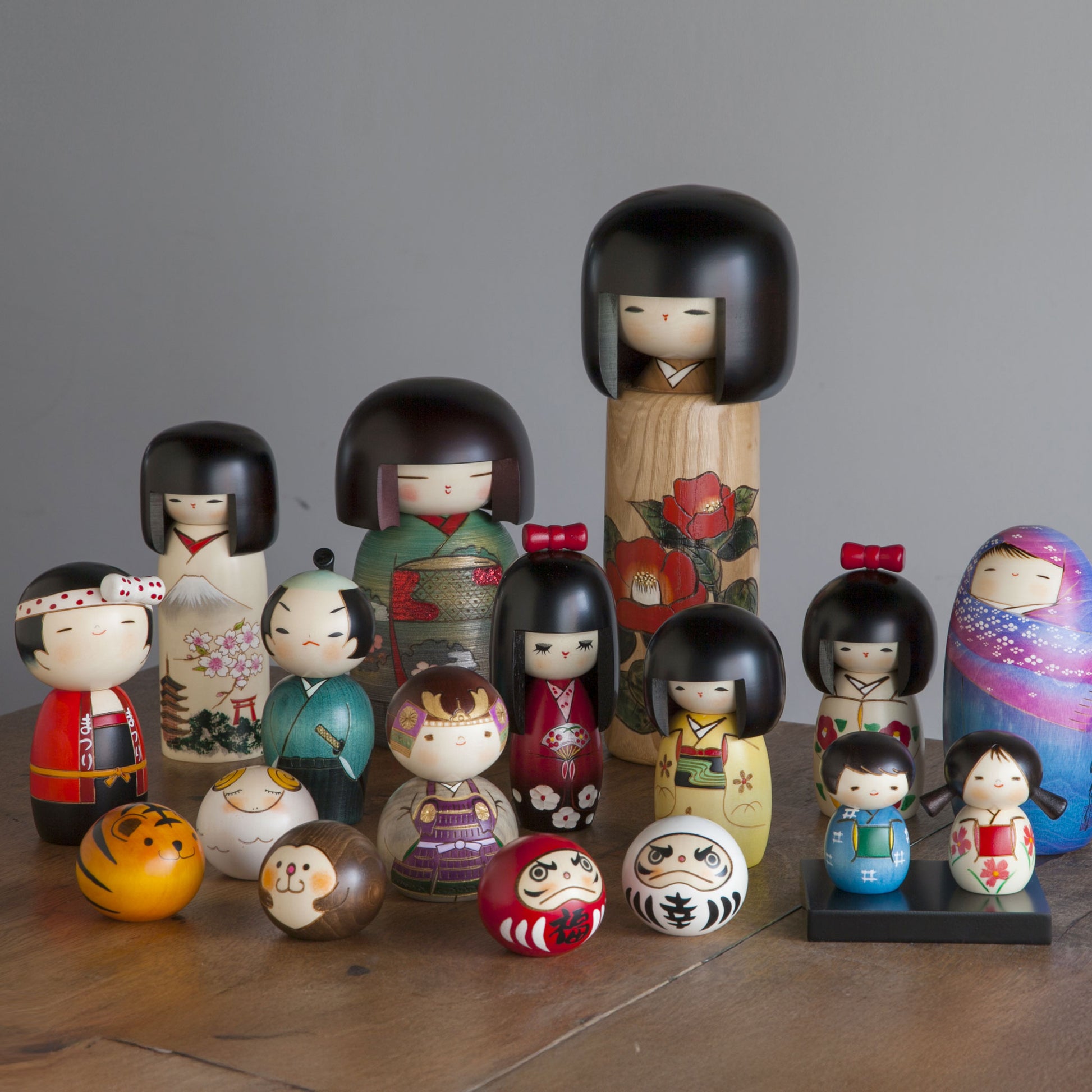 本商品(こけし単品)のほかに、こけしをより華やかに飾っていただける「高級綸子座布団」と「金屏風」がセットになった商品や、その他なじみ深いキャラクターや干支シリーズもございます。