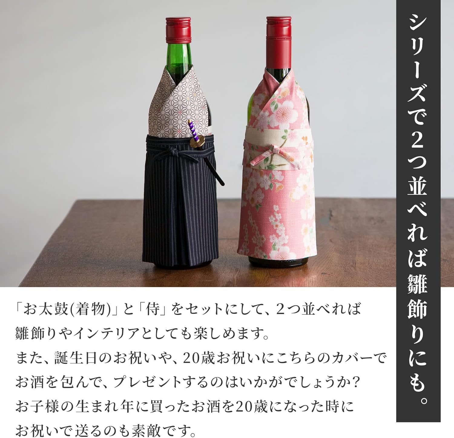 着物ボトルカバーは、ペアで飾ればさらに雰囲気が華やかに。伝統的な和柄デザインが美しさを引き立て、特別なひとときを演出します。