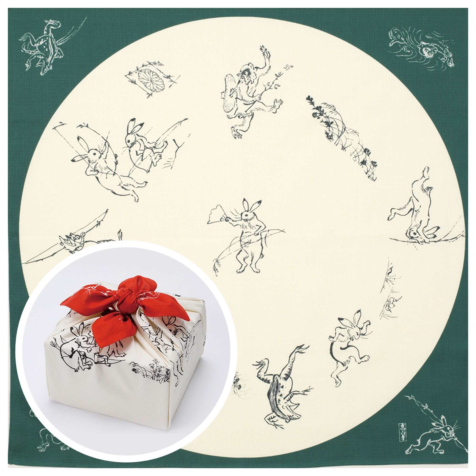 国宝「鳥獣人物戯画」は、京都の高山寺に伝わる紙本墨画の絵巻物です。漫画の元祖ともいわれ、卓越した筆さばきで描かれた愛嬌のある動物たちは、時代を超えて今日でも人気を博しています。動物たちを擬人化してユーモラスに描いた絵巻物の世界観を一枚の風呂敷に再現いたしました。